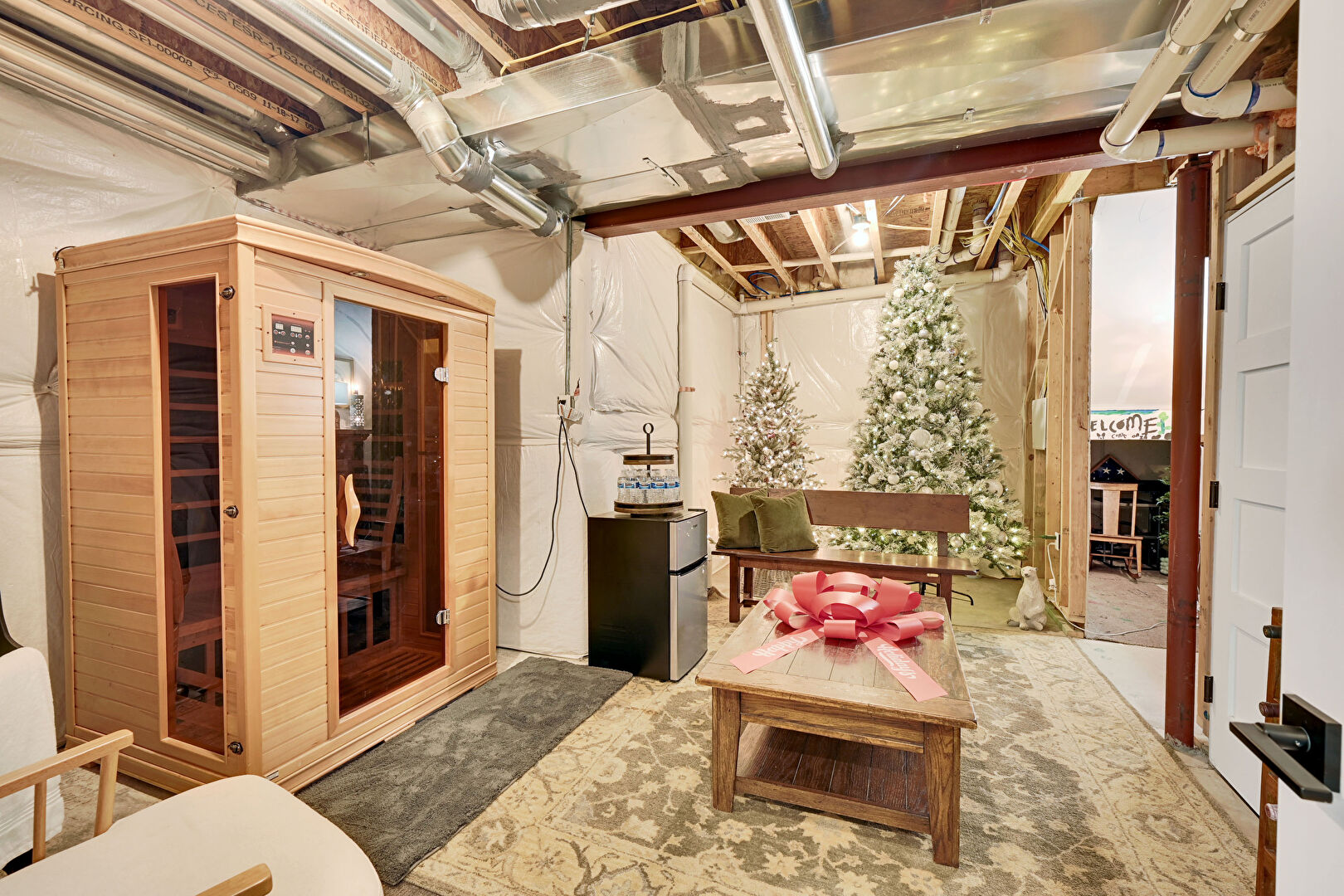 Drywall, Medium Brown Cabinets, Sauna, Vaulted Ceiling, Basement, Glass Insert Cabinets