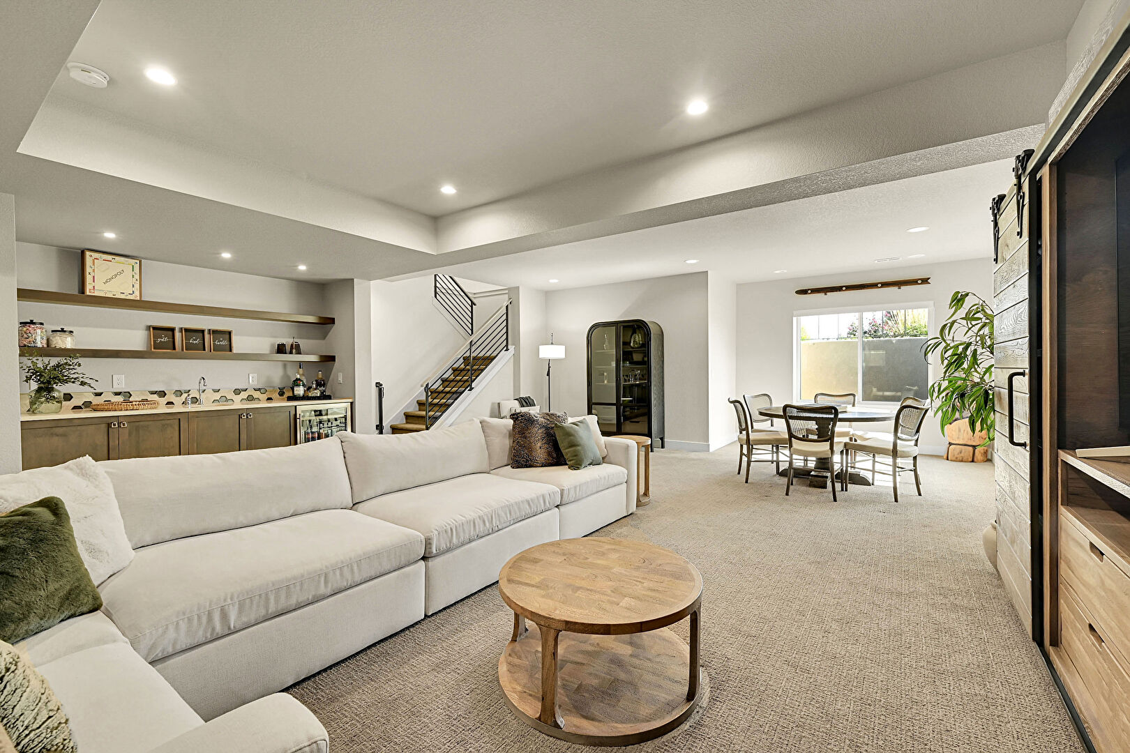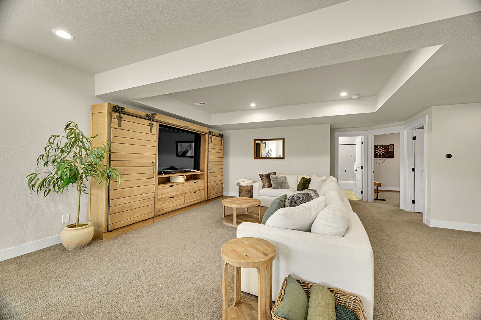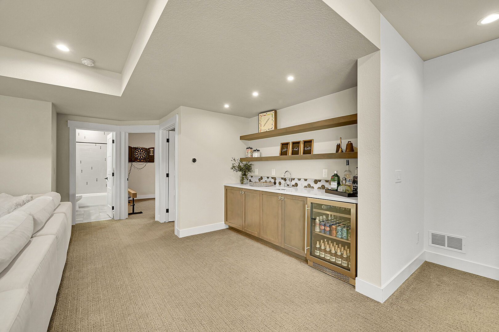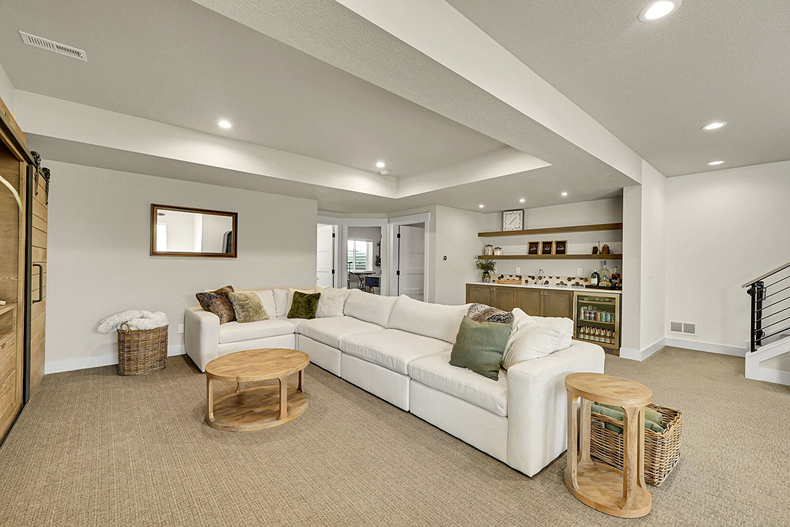 Barn Door, Baseboards Wall, Carpet, Drywall, Indoor Bar, Natural Light, Recessed Lighting, Smoke Carbon Monoxide Detector, Stairs, Textured Ceiling, Textured Wall, Tray Ceiling, Vent, Wine Cooler, Carpet, Drywall, Indoor Bar, Natural Light, Textured Ceiling, Textured Wall