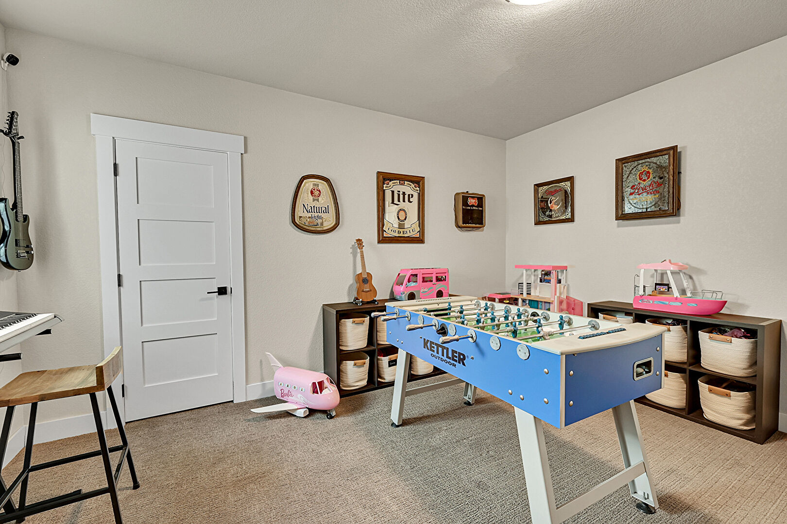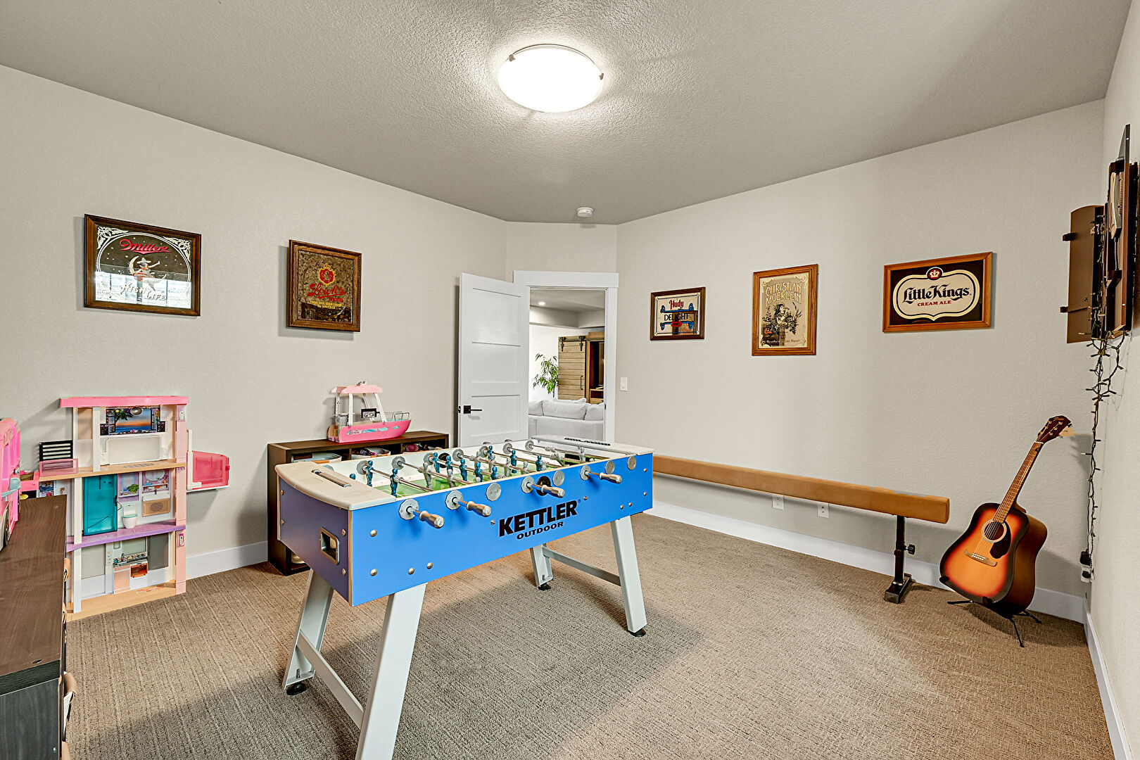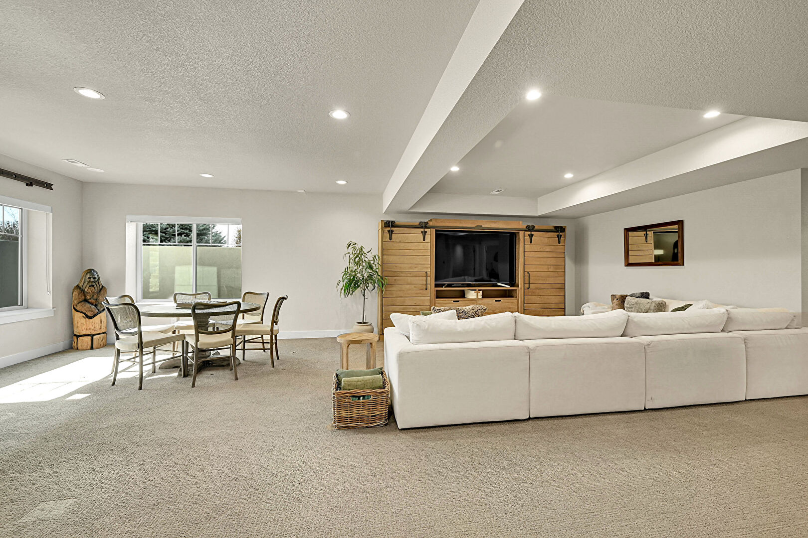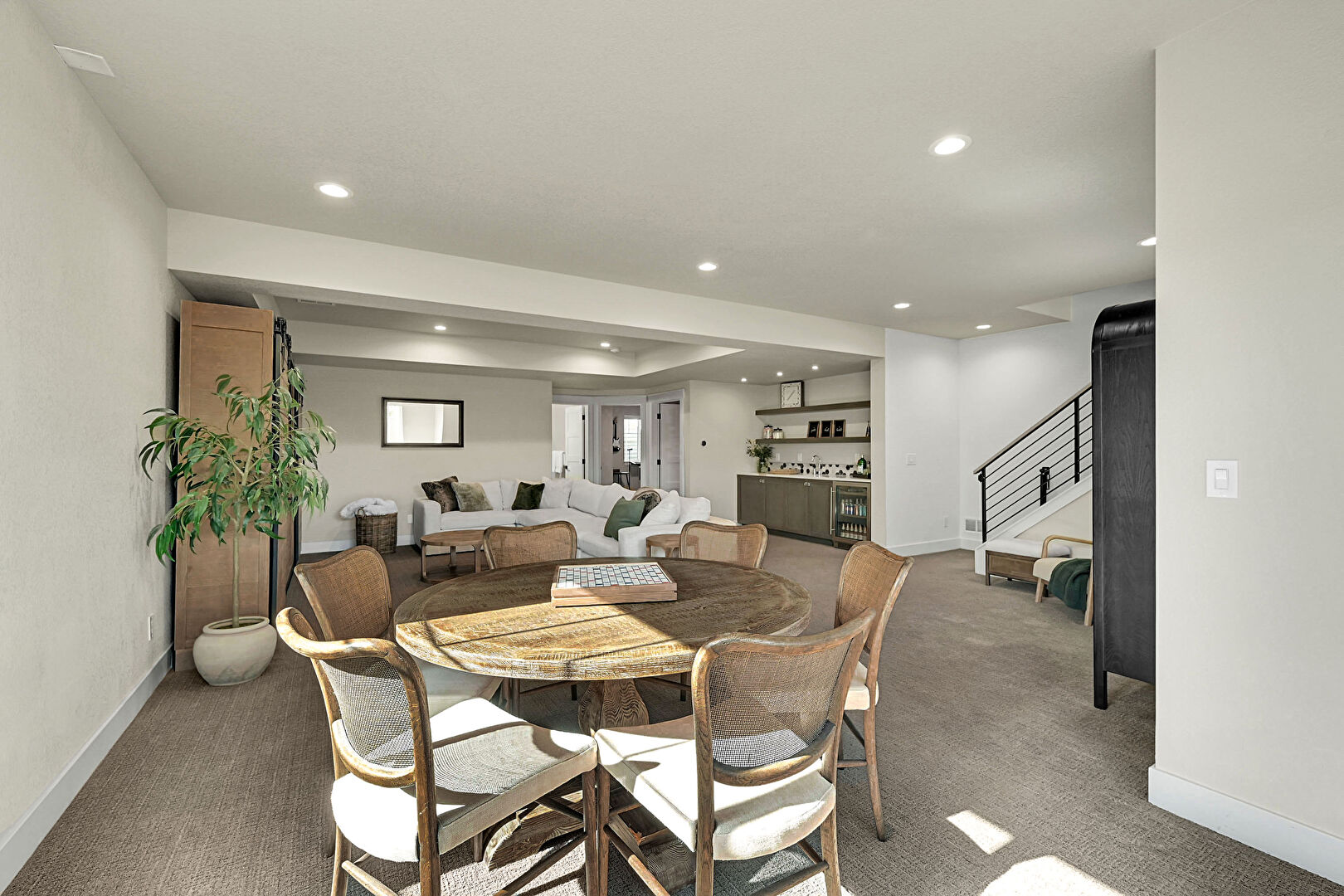 Barn Door, Baseboards Wall, Carpet, Drywall, Indoor Bar, Natural Light, Recessed Lighting, Smoke Carbon Monoxide Detector, Stairs, Textured Ceiling, Textured Wall, Tray Ceiling, Vent, Wine Cooler, Carpet, Drywall, Indoor Bar, Natural Light, Textured Ceiling, Textured Wall