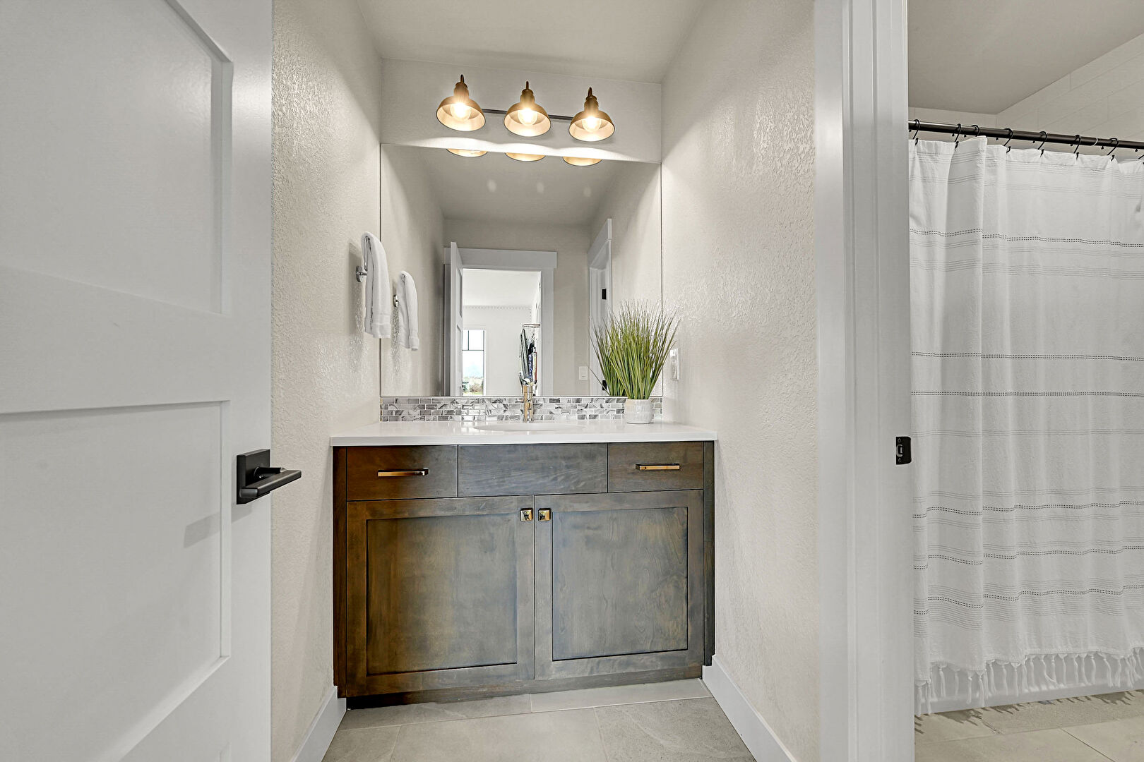 Baseboards Wall, Full Bathroom, Textured Wall, Tile Floor, Vanity, Natural Light