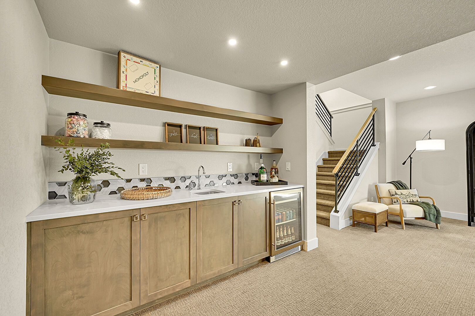 Baseboards Wall, Carpet, Drywall, Indoor Bar, Medium Brown Cabinets, Open Shelves, Recessed Lighting, Shaker Cabinets, Smoke Carbon Monoxide Detector, Stairs, Stone Countertops, Textured Ceiling, Vent, Wine Cooler, Baseboards Wall, Wine Cooler