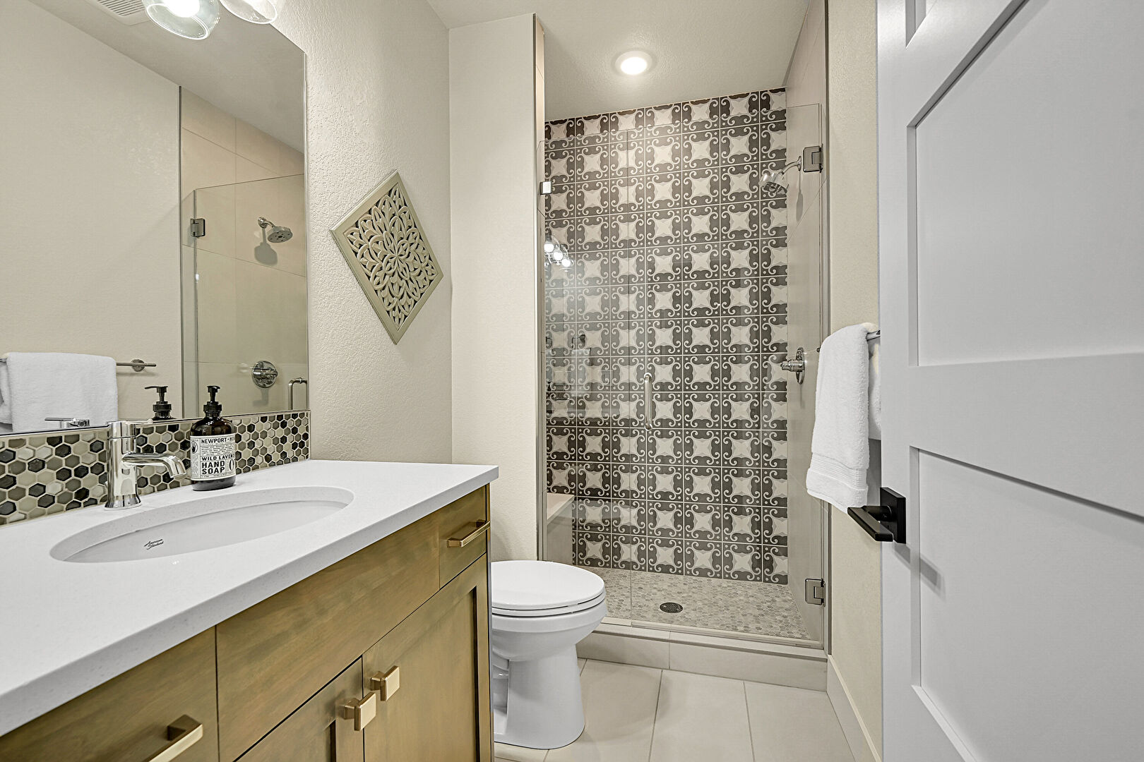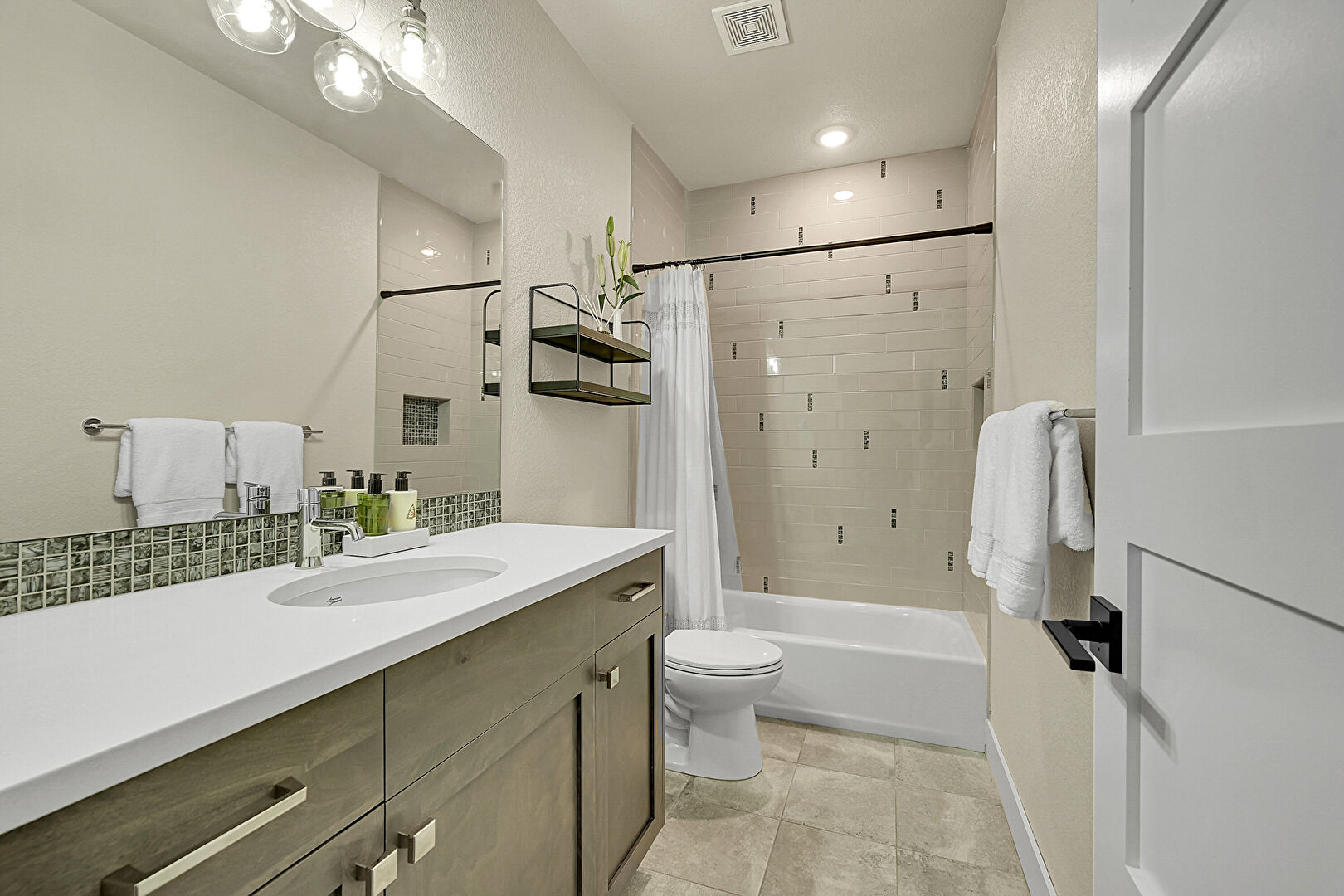 Baseboards Wall, Combined Bath Shower, Full Bathroom, Recessed Lighting, Textured Wall, Tile Floor, Vanity, Vent