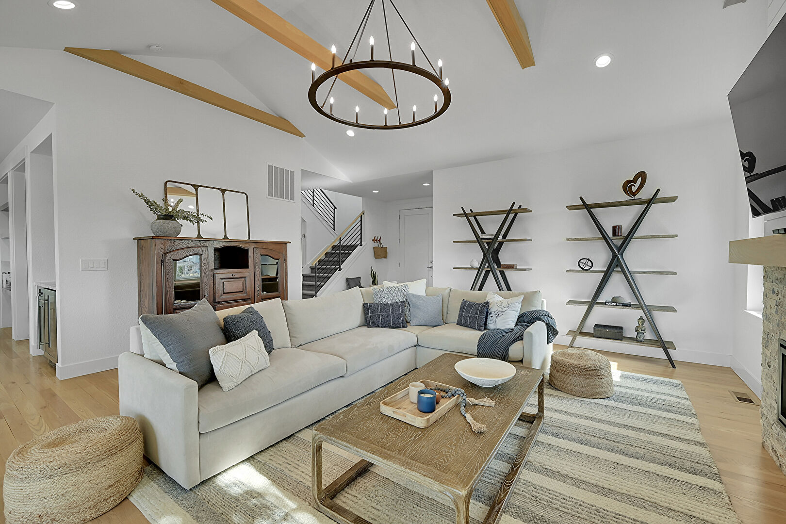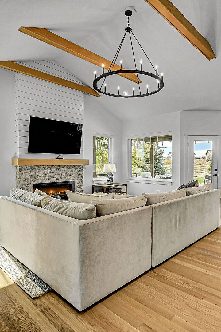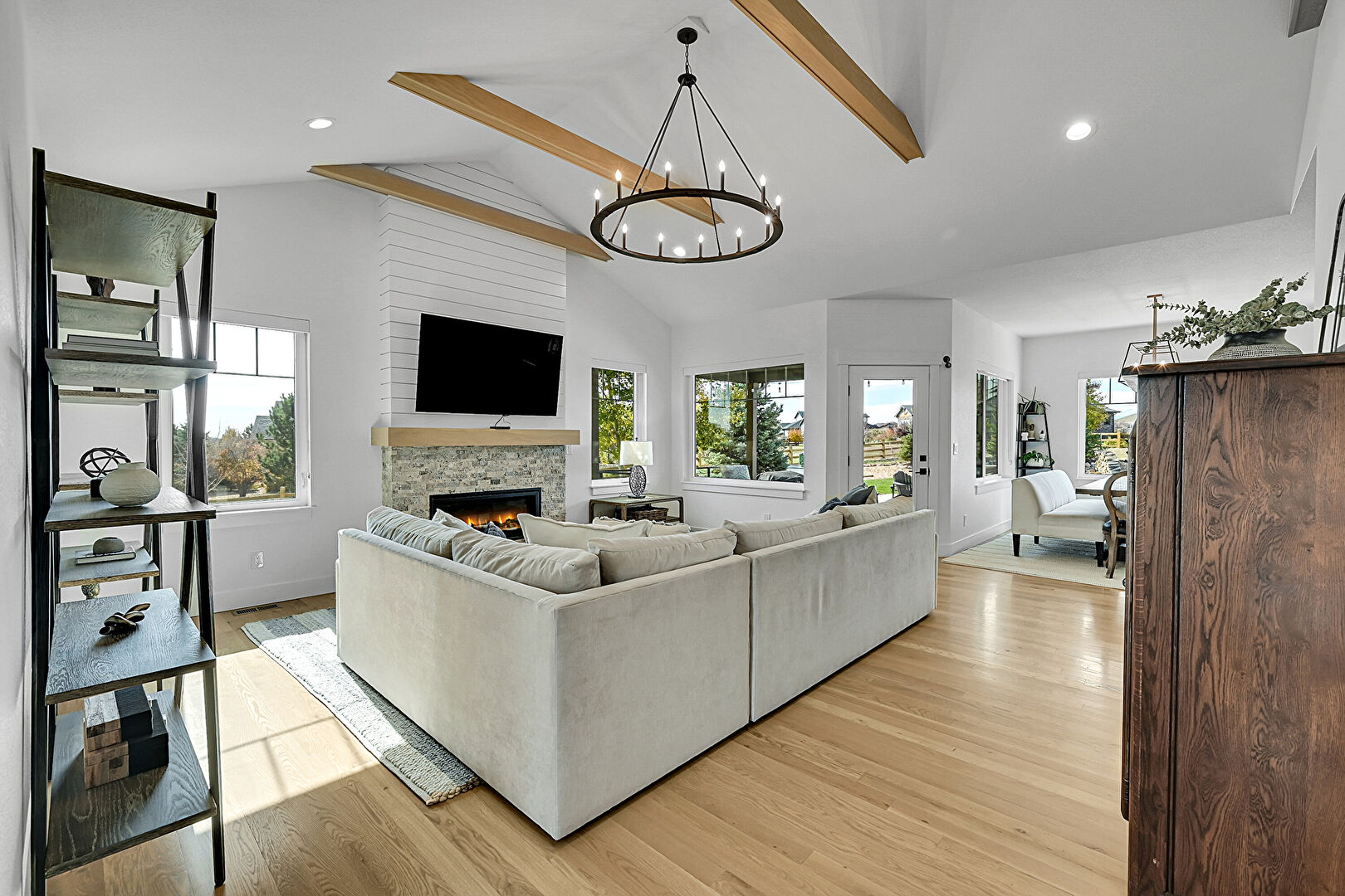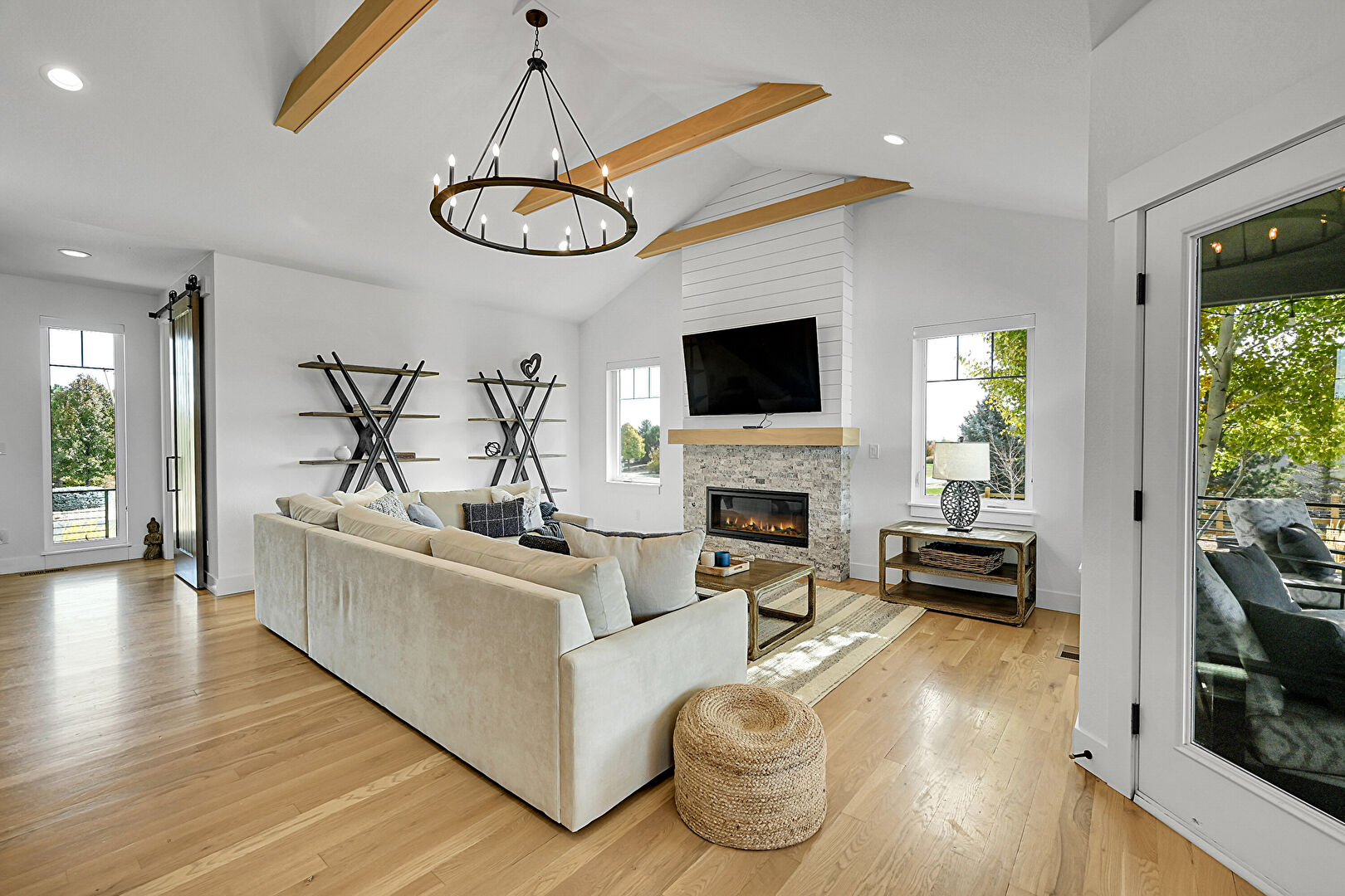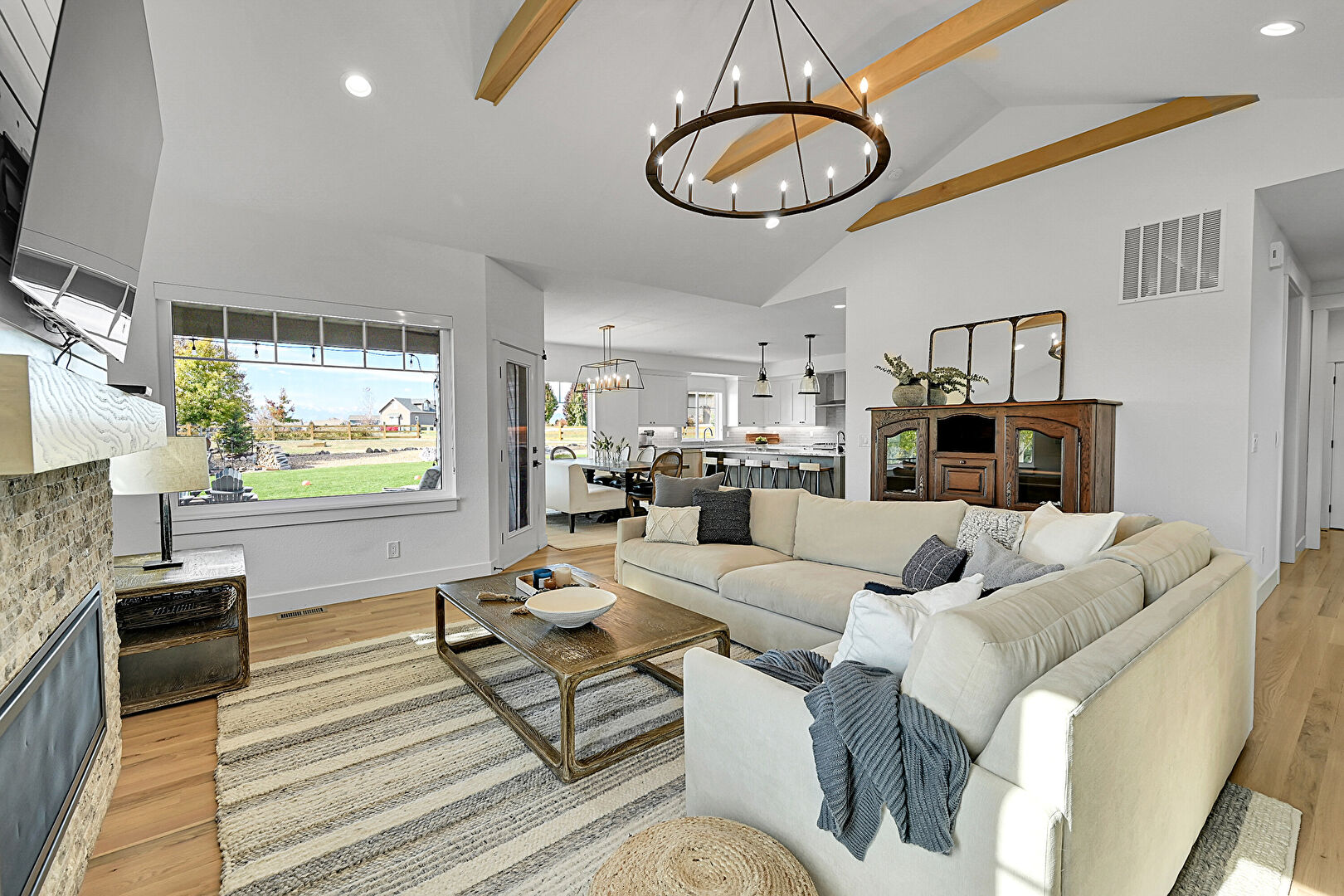 Barn Door, Baseboards Wall, Beamed Ceiling, Cathedral Ceiling, Drywall, Fireplace, High Ceiling, Natural Light, Notable Chandelier, Recessed Lighting, Stairs, Vaulted Ceiling, Vent, Wood Finish Floor, Fireplace, High Ceiling, Natural Light, Notable Chandelier, Vaulted Ceiling