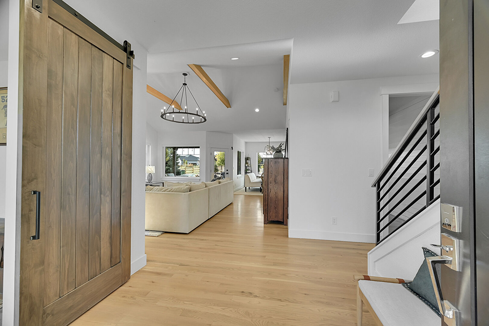 Baseboards Wall, Beamed Ceiling, Drywall, Natural Light, Notable Chandelier, Recessed Lighting, Stairs, Vaulted Ceiling, Wood Finish Floor, Barn Door
