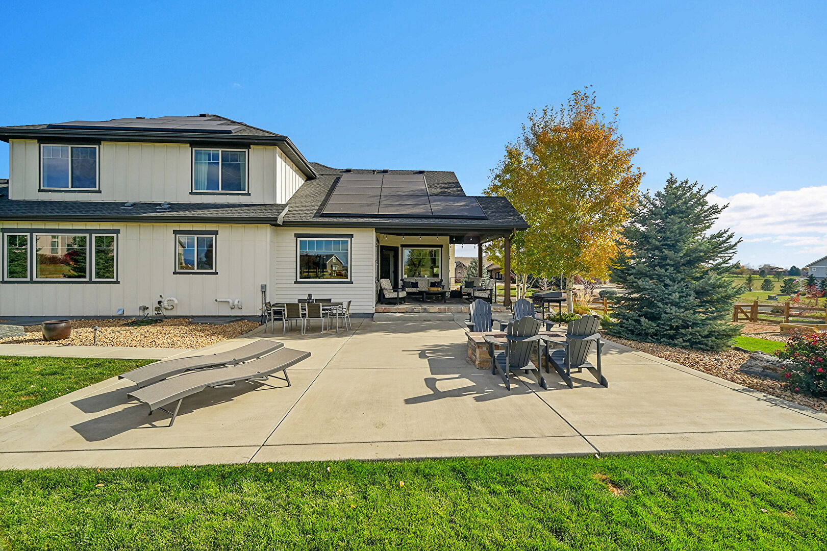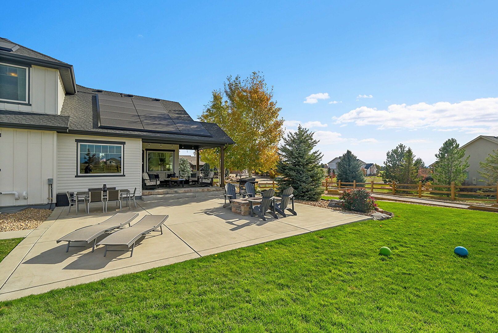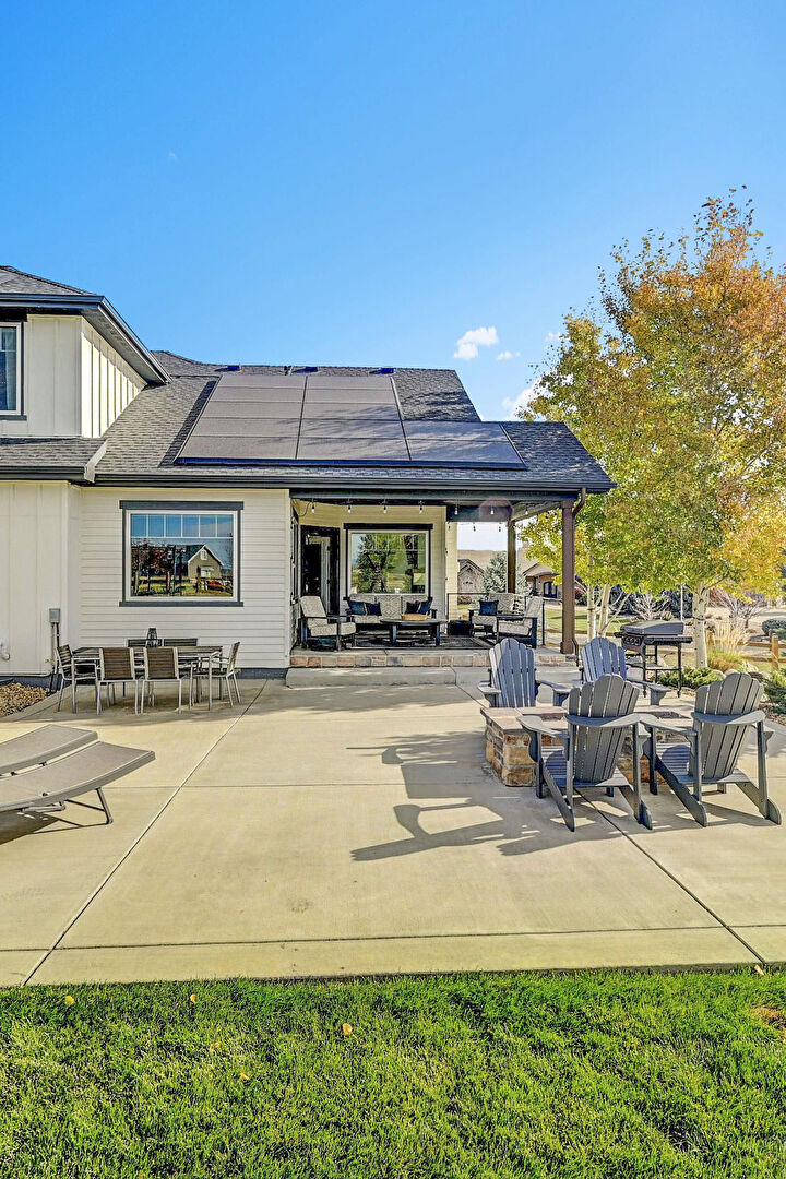 Board Batten Siding, Concrete Foundation, Downspout, Fence, Fire Pit, Gutters, Horizontal Siding, Hot Tub, Lawn, Outdoor Dining Area, Outdoor Living Space, Patio, Shingle Roof, Solar Panels, Vertical Siding, Downspout, Fence, Fire Pit, Outdoor Dining Area