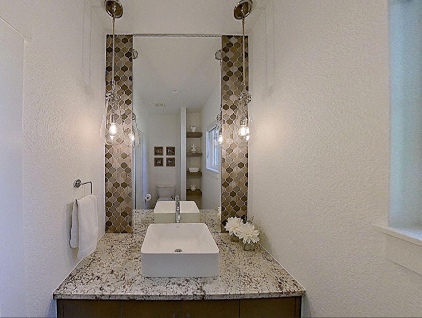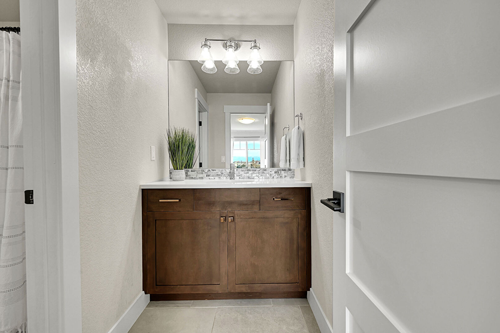 Baseboards Wall, Full Bathroom, Natural Light, Tile Floor, Vanity, Textured Wall