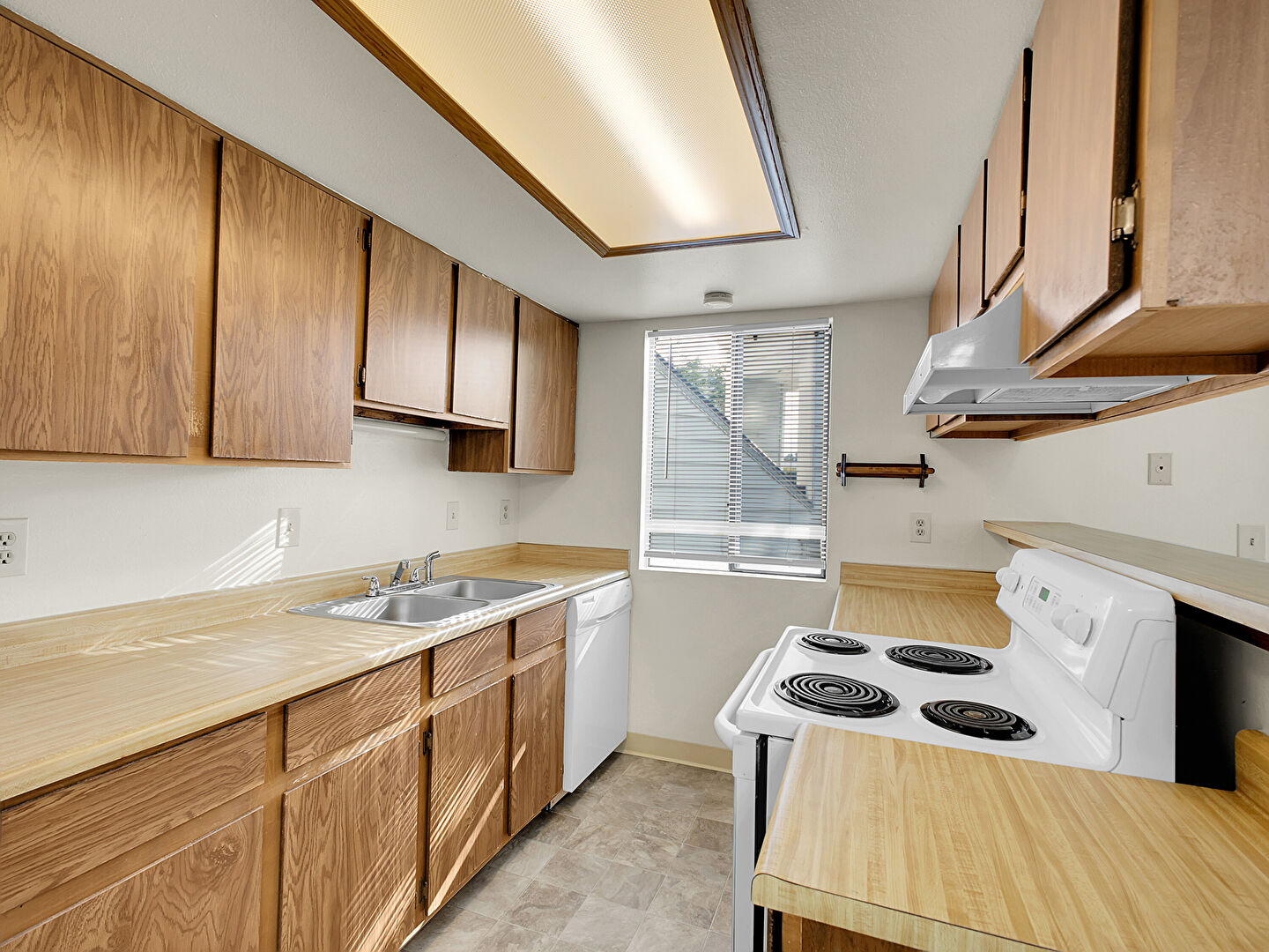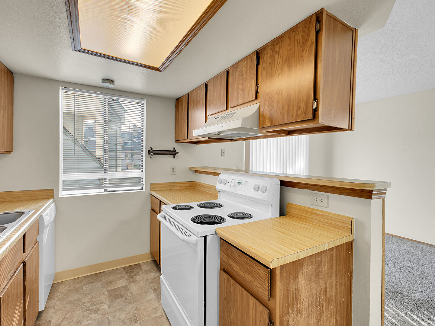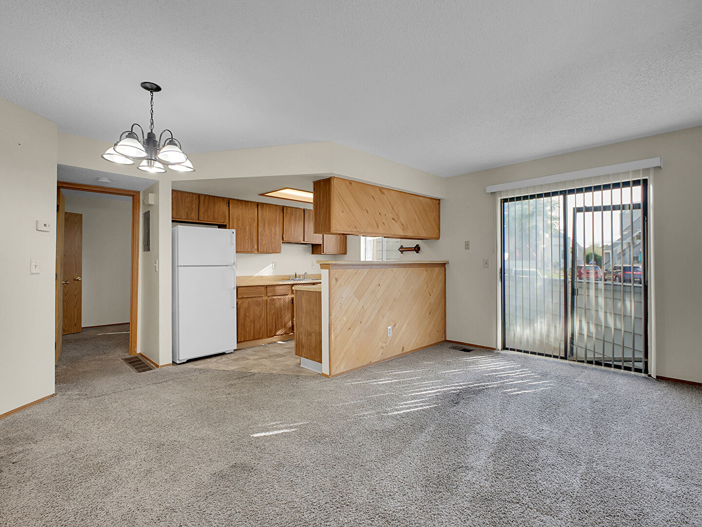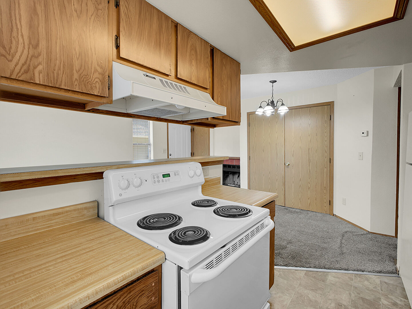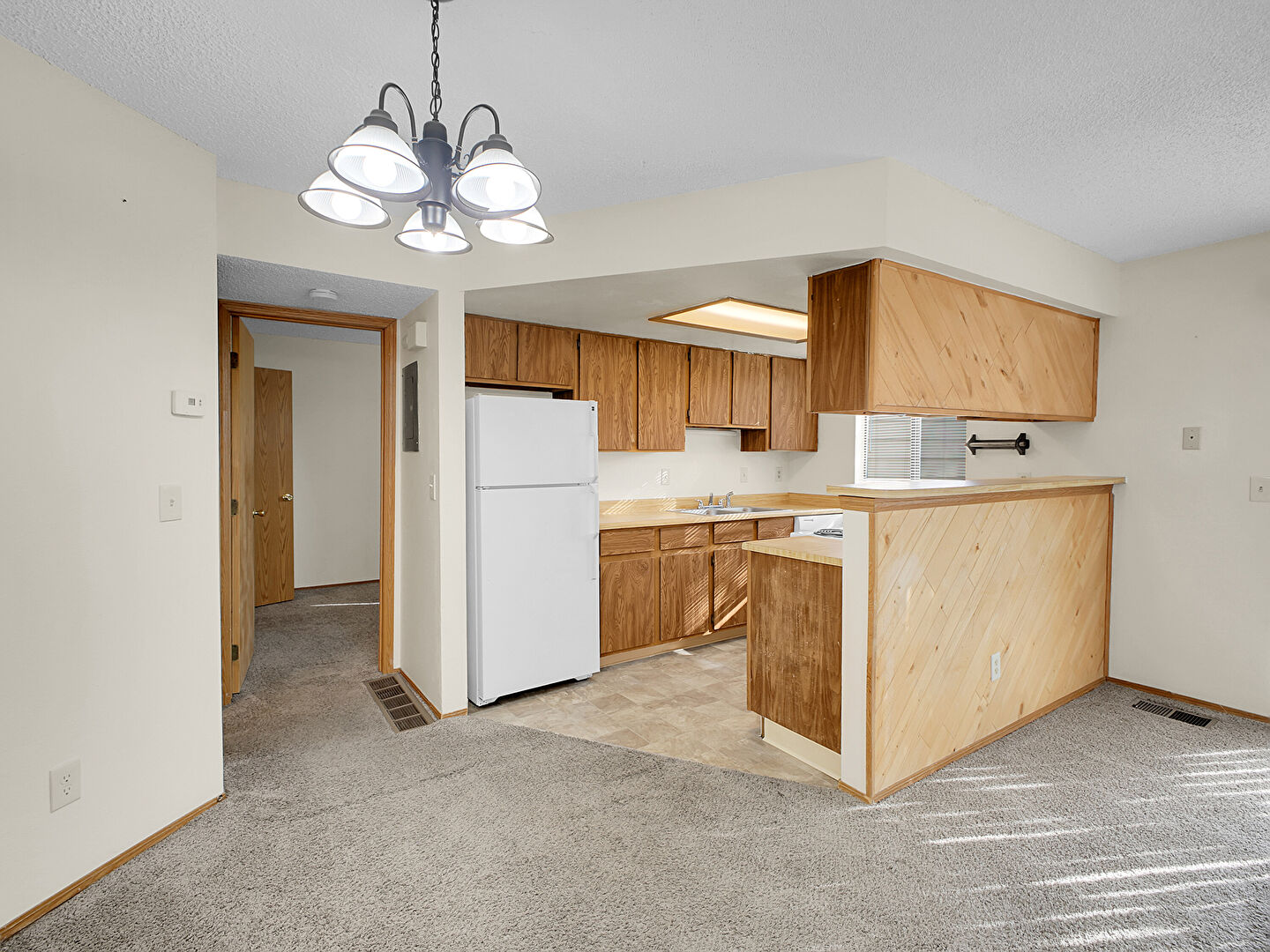 Baseboards Wall, Carpet, Drywall, Kitchen Peninsula, Medium Brown Cabinets, Natural Light, Notable Chandelier, Opens To Living Area, Pendant Lighting, Stone Finish Floor, Textured Ceiling, U Shaped Kitchen, Vent, Visible Hinge Cabinets, Drywall, Kitchen Bar, Kitchen Peninsula, Medium Brown Cabinets, Natural Light, Notable Chandelier