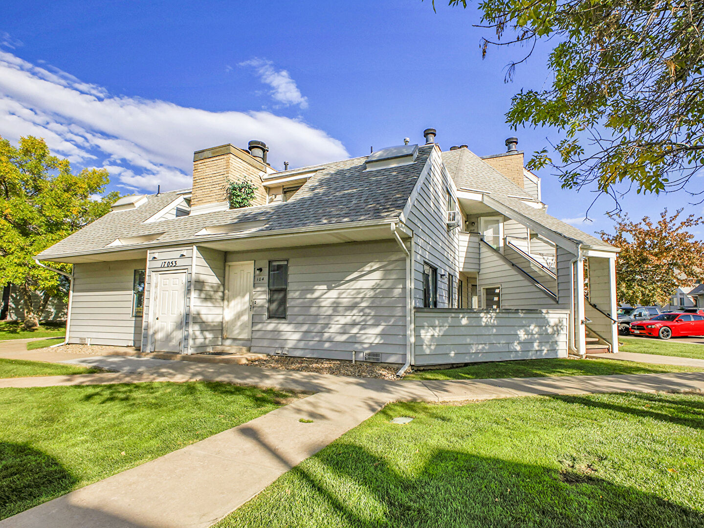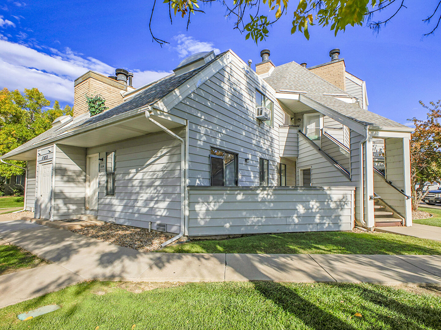 Chimney, Concrete Foundation, Downspout, Gutters, Horizontal Siding, Lawn, Shingle Roof, Stairs, Window Mounted Ac, Water Meter