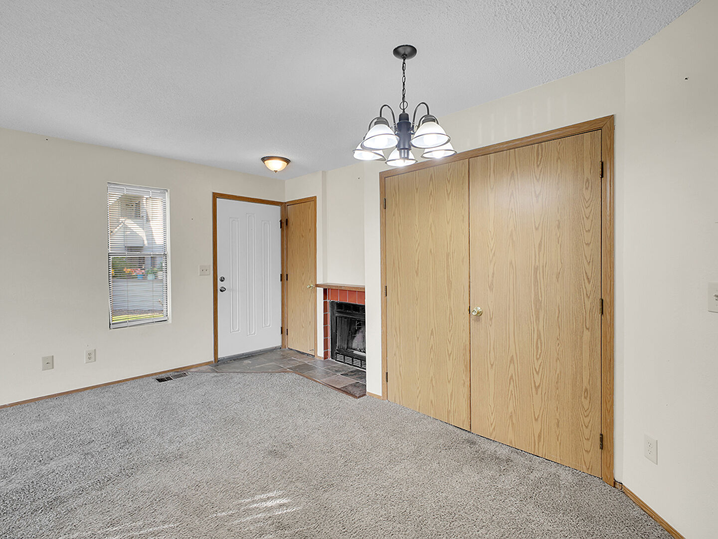 Baseboards Wall, Drywall, Fireplace, Natural Light, Notable Chandelier, Textured Ceiling, Vent, Carpet