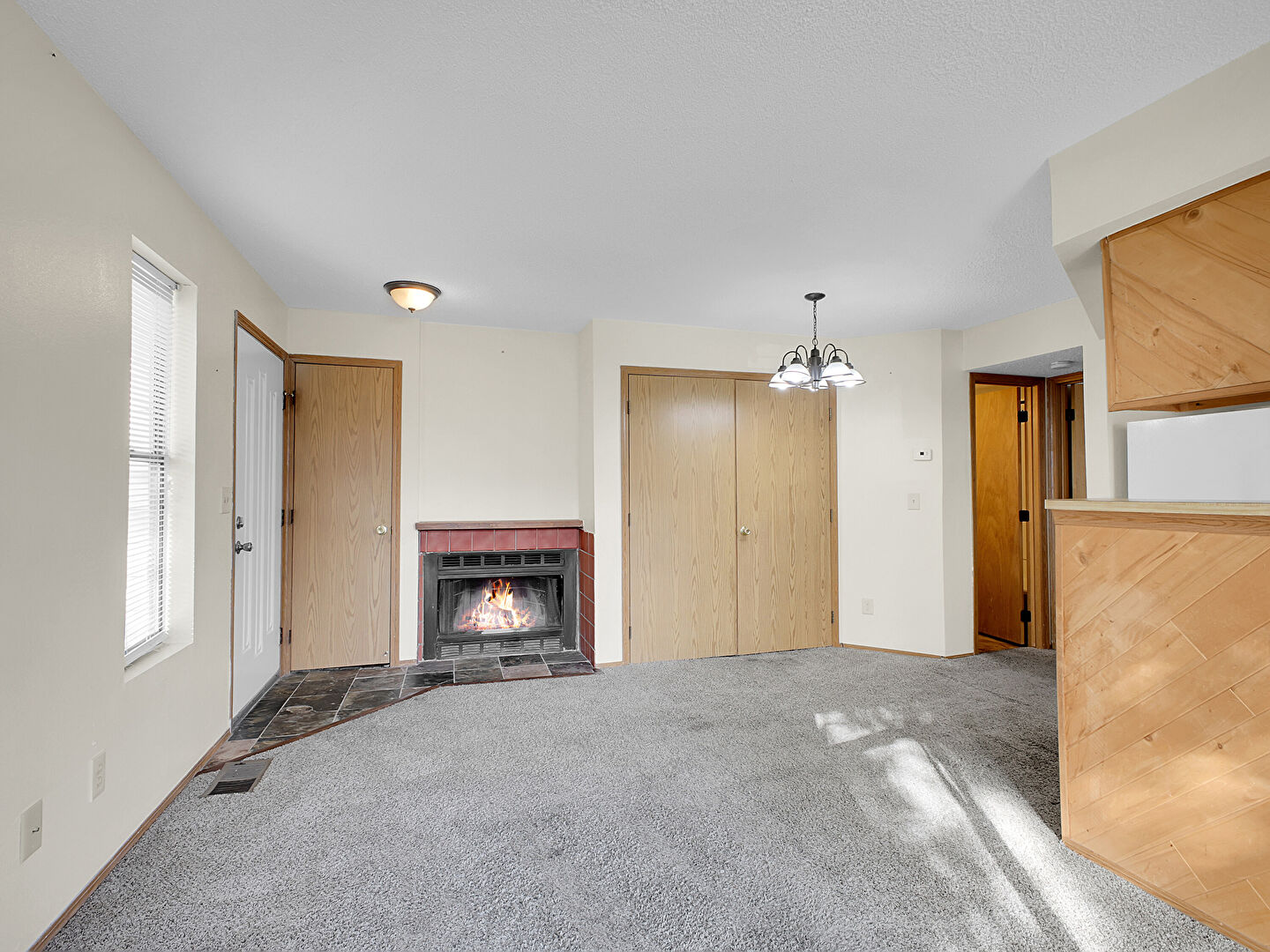 Baseboards Wall, Drywall, Fireplace, Natural Light, Notable Chandelier, Stone Finish Floor, Vent, Carpet