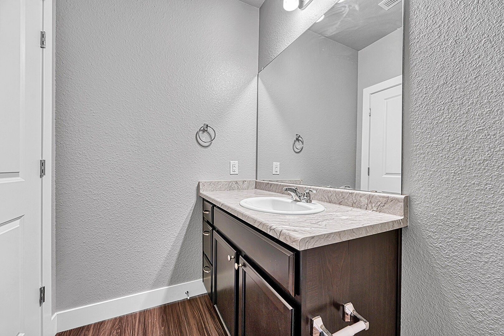 Baseboards Wall, Combined Bath Shower, Full Bathroom, Half Bathroom, Textured Wall, Vanity, Vent, Wood Finish Floor, Full Bathroom, Wood Finish Floor