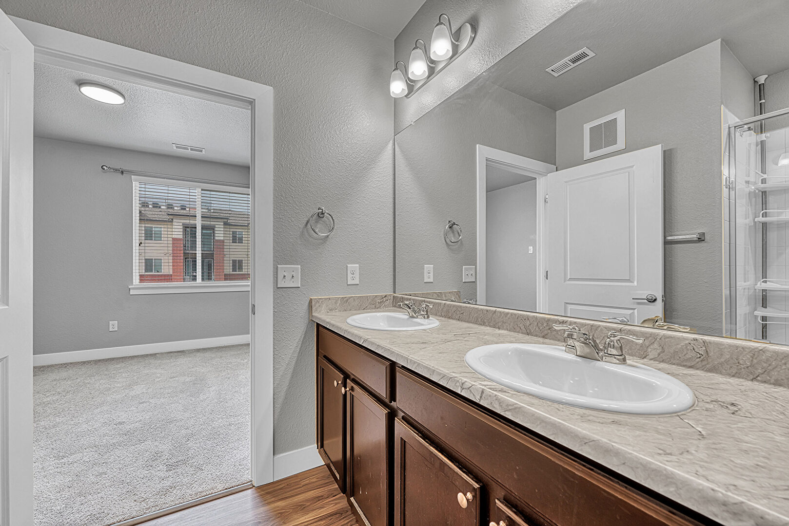 Baseboards Wall, Carpet, Double Vanity, Full Bathroom, Textured Ceiling, Textured Wall, Vent, Wood Finish Floor, Baseboards Wall, Natural Light, Textured Wall