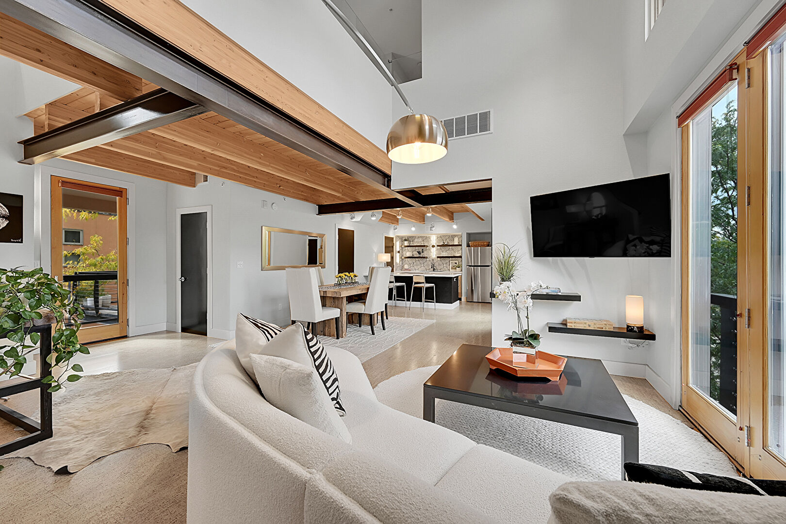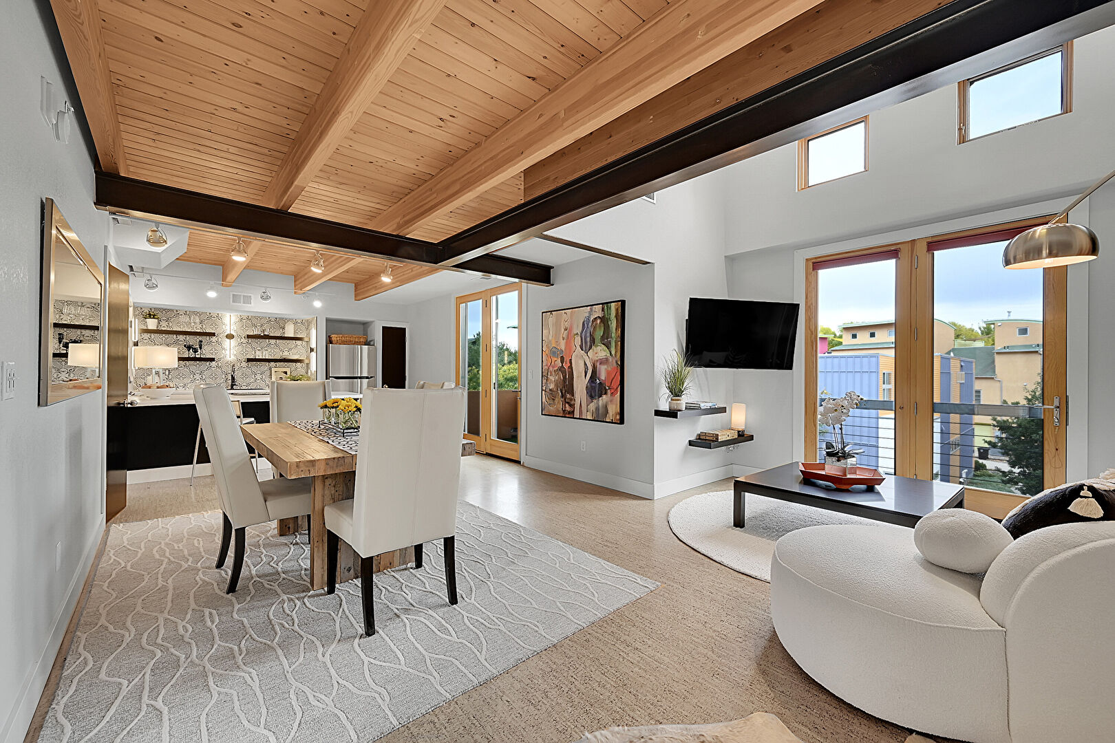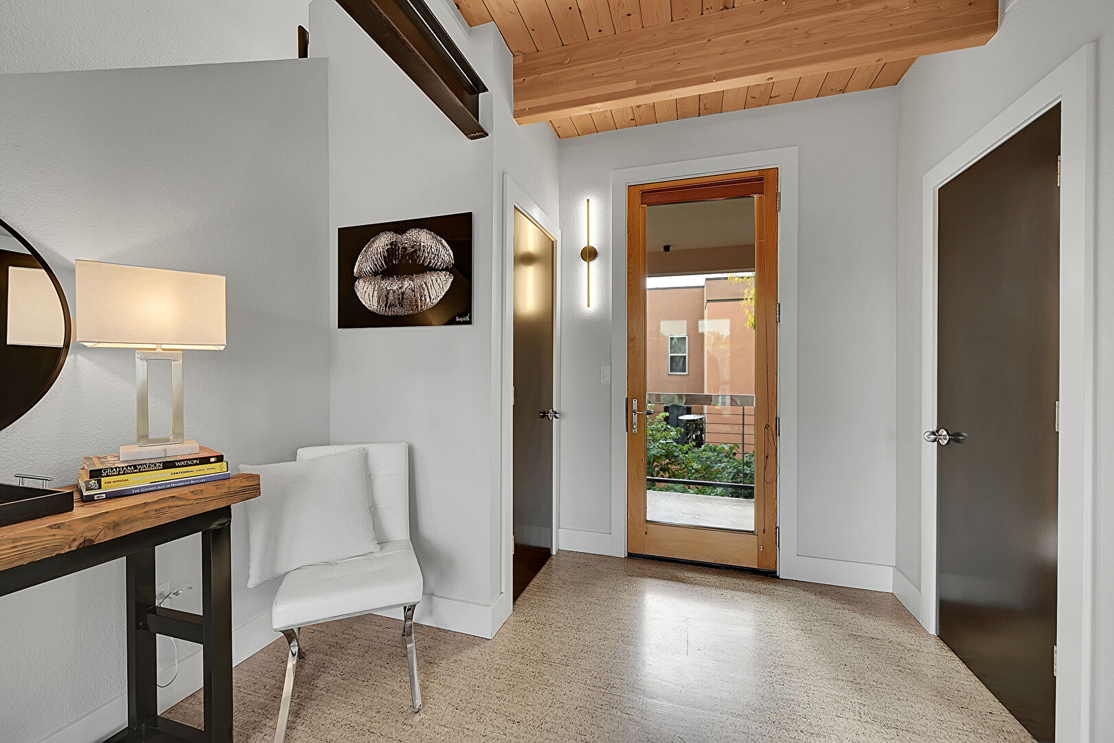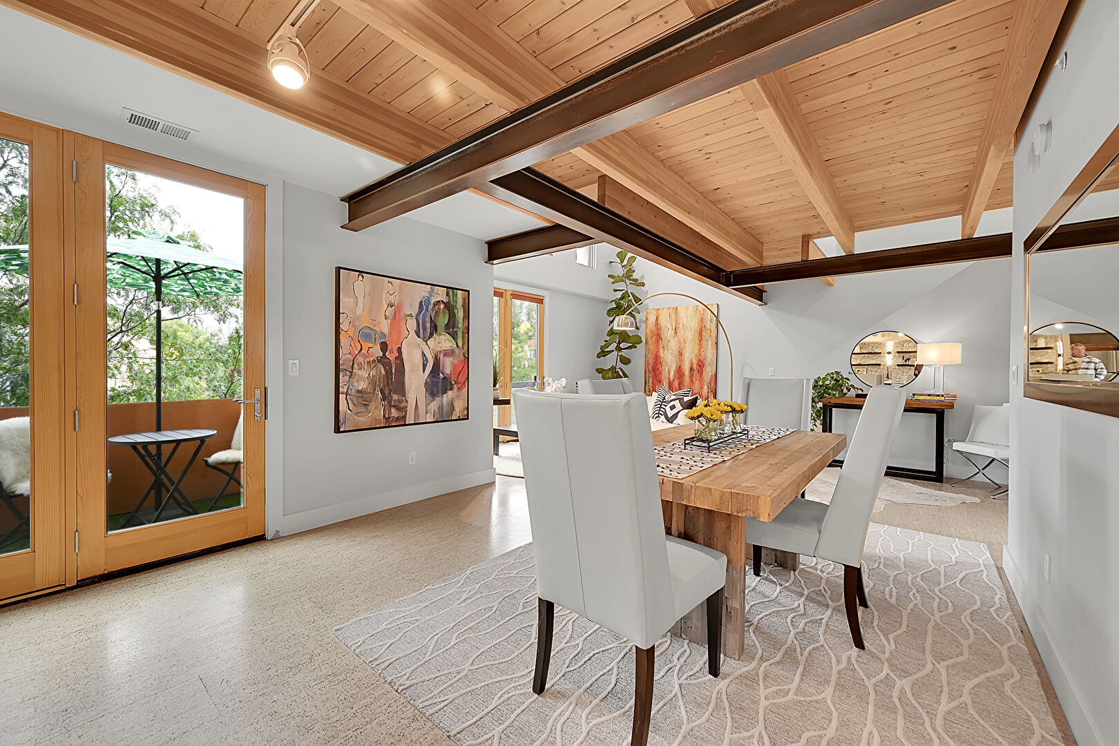 Baseboards Wall, Beamed Ceiling, Concrete Floor, Drywall, French Doors, Natural Light, Wood Ceiling, Drywall, Vent