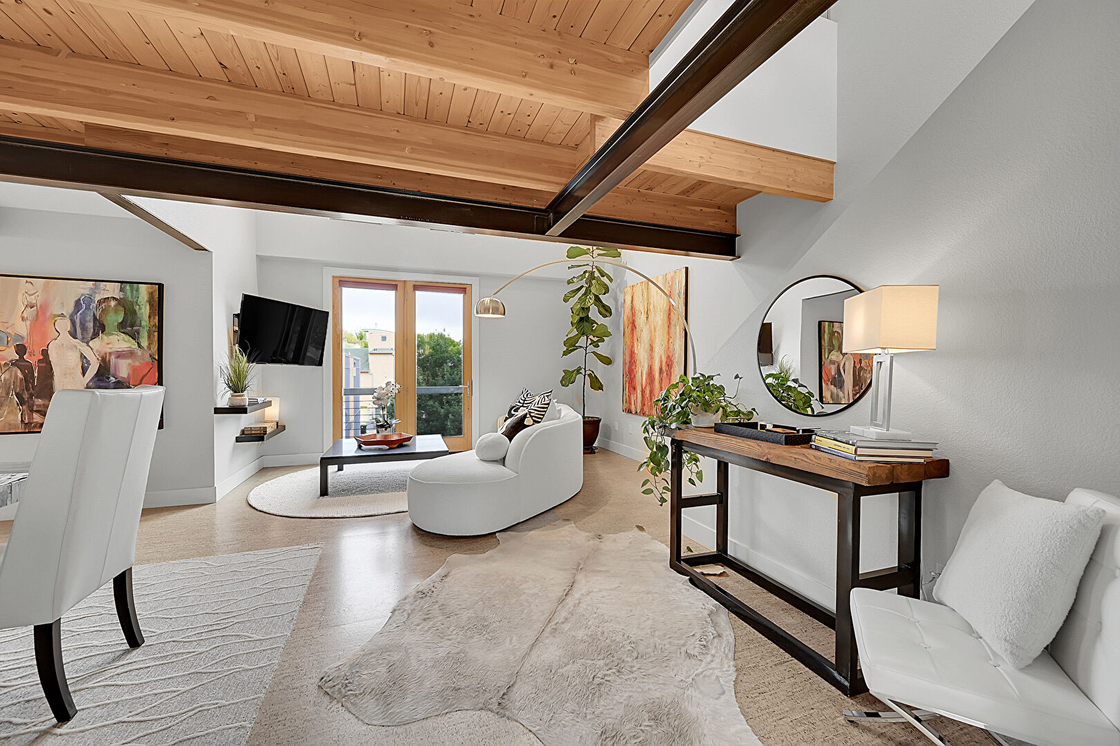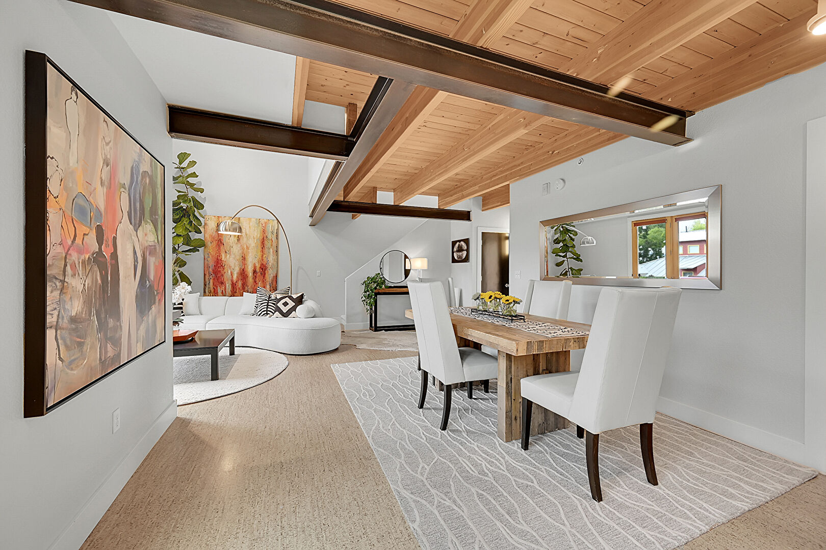 Baseboards Wall, Beamed Ceiling, Drywall, Wood Ceiling, Natural Light