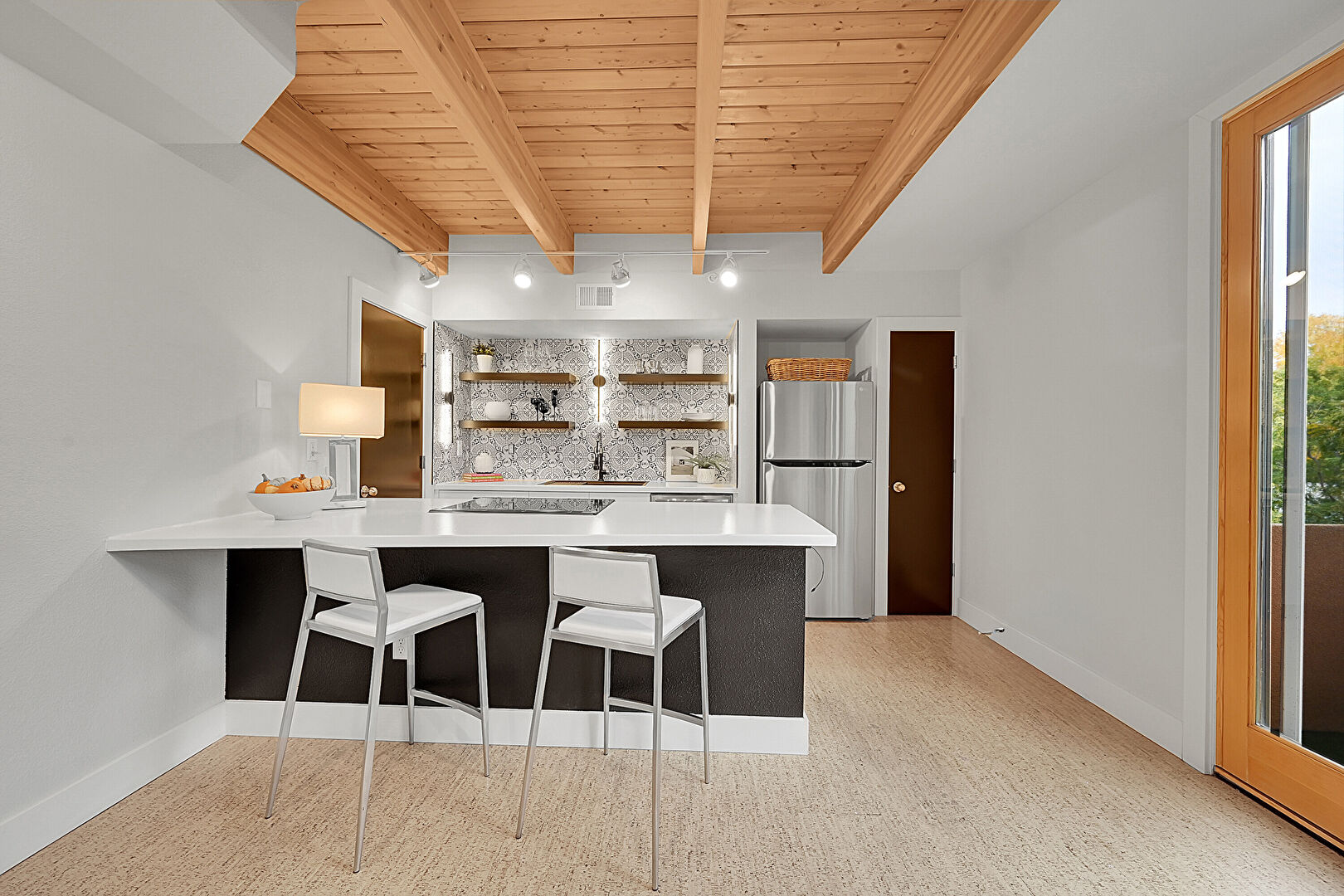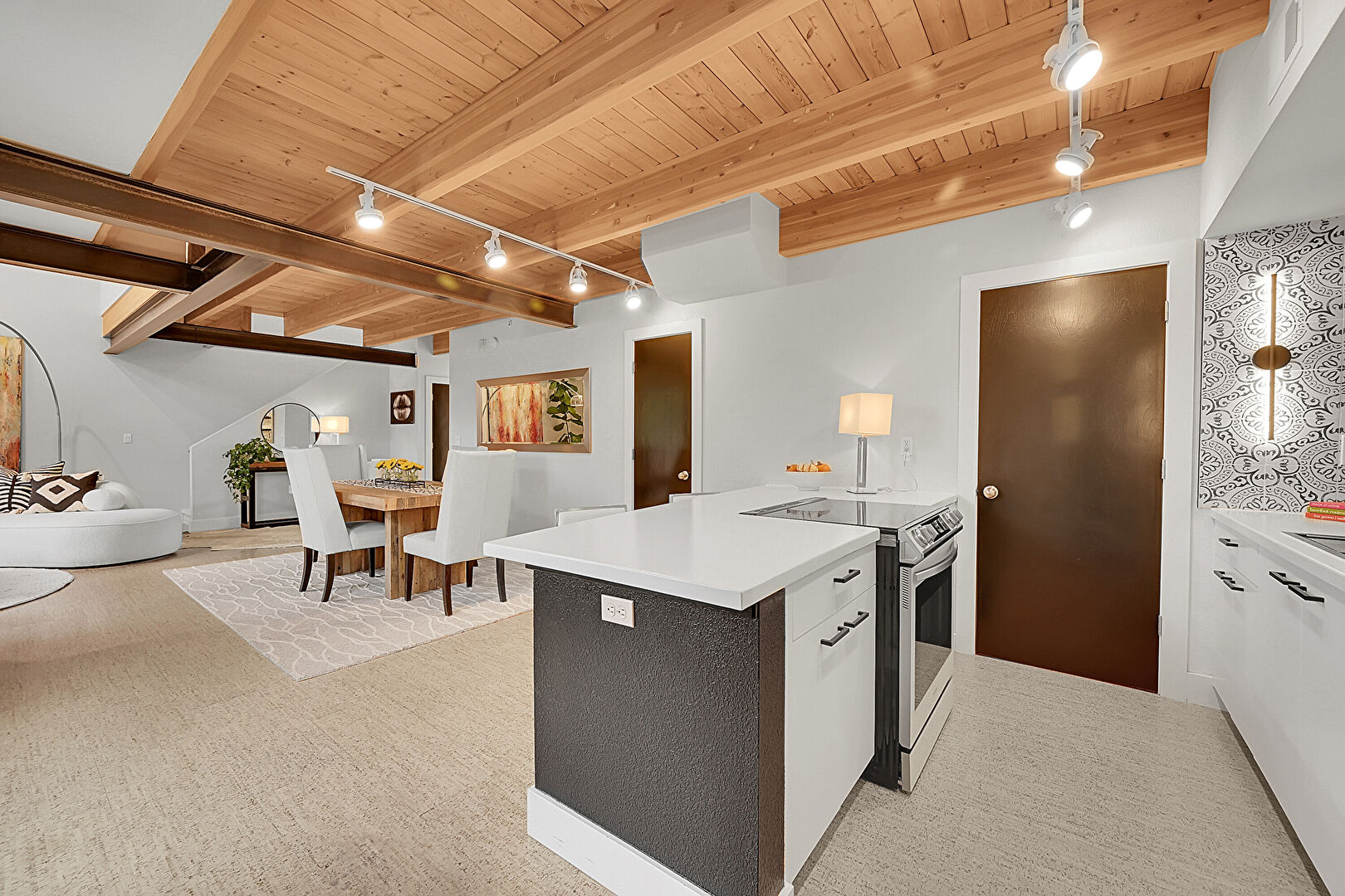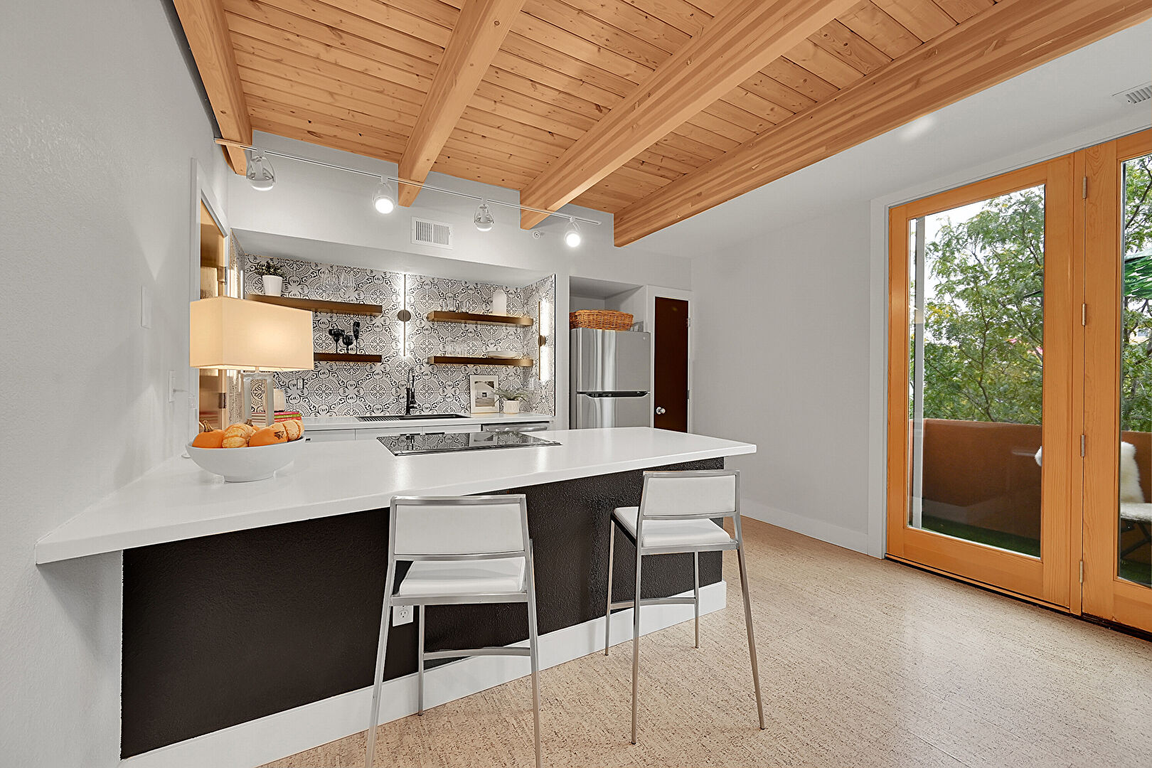 Baseboards Wall, Beamed Ceiling, Carpet, Dark Brown Cabinets, Drywall, Flat Panel Cabinets, Galley Kitchen, Kitchen Bar, Kitchen Peninsula, Natural Light, Open Shelves, Opens To Living Area, Pendant Lighting, Stone Countertops, Track Lighting, U Shaped Kitchen, Vent, Wood Ceiling, Baseboards Wall, Dark Brown Cabinets, Kitchen Bar, Open Shelves, Vent