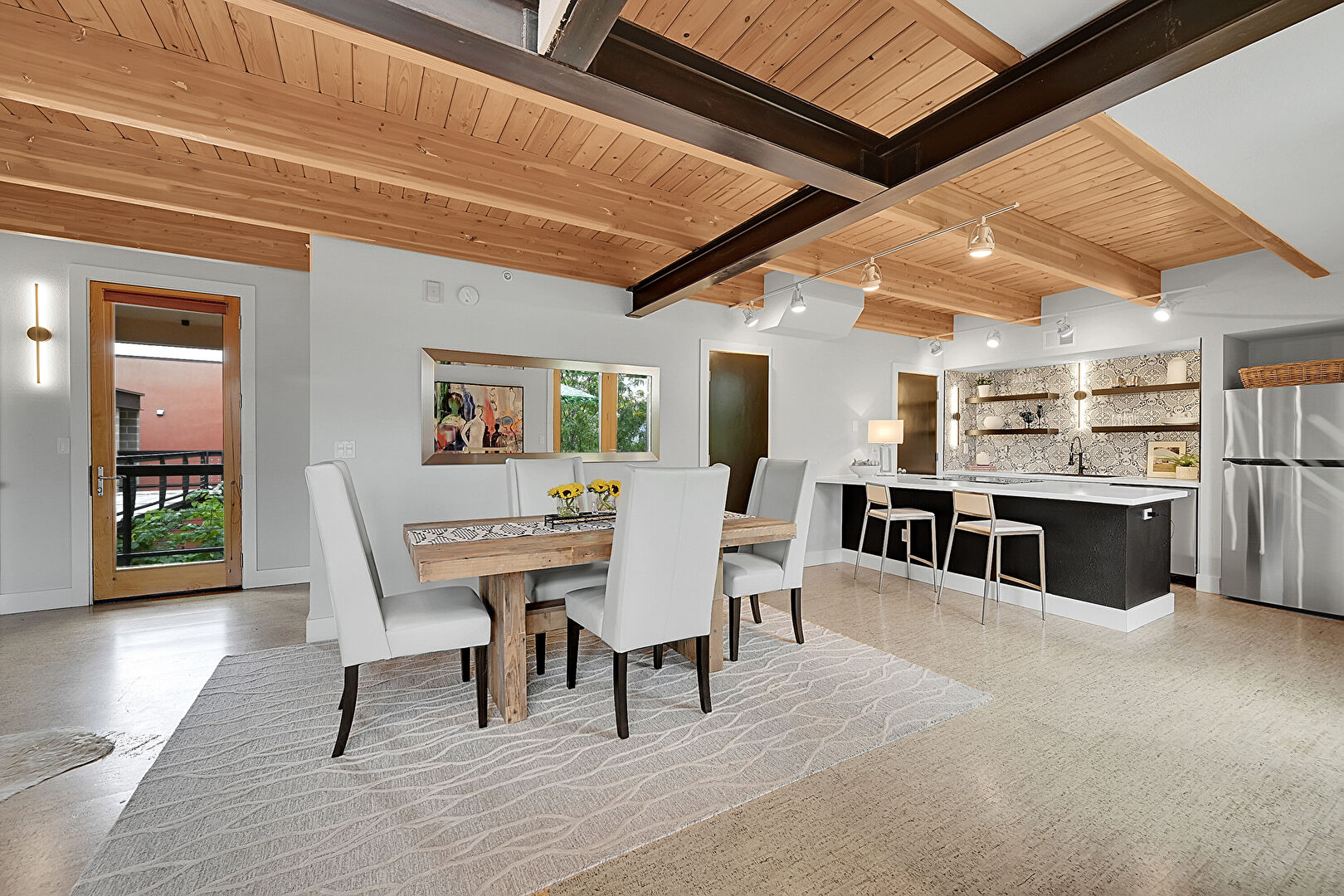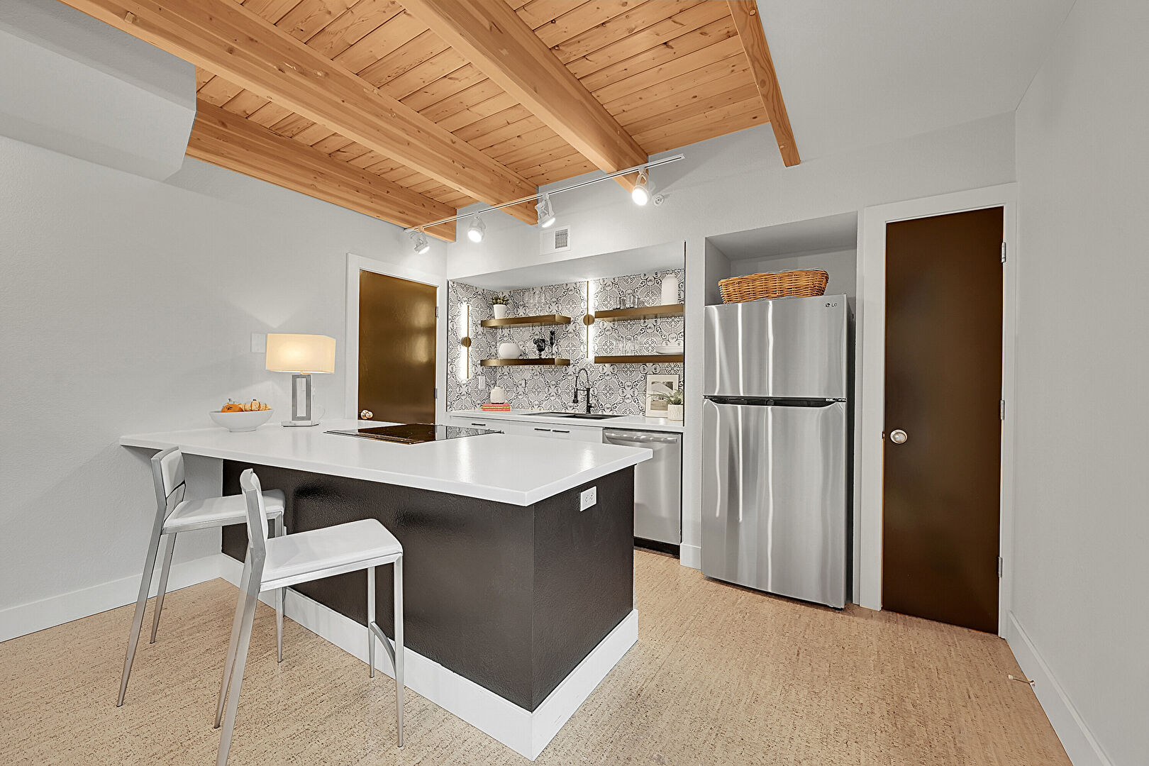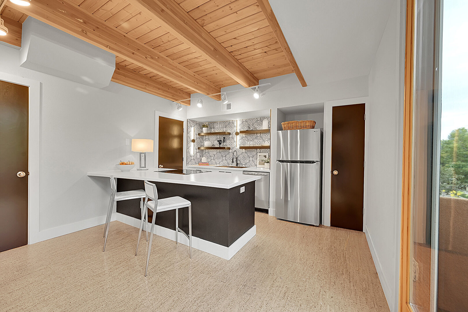 Baseboards Wall, Beamed Ceiling, Carpet, Dark Brown Cabinets, Drywall, Flat Panel Cabinets, Galley Kitchen, Kitchen Bar, Kitchen Peninsula, Natural Light, Open Shelves, Opens To Living Area, Pendant Lighting, Stone Countertops, Track Lighting, U Shaped Kitchen, Vent, Wood Ceiling, Baseboards Wall, Dark Brown Cabinets, Kitchen Bar, Open Shelves, Vent