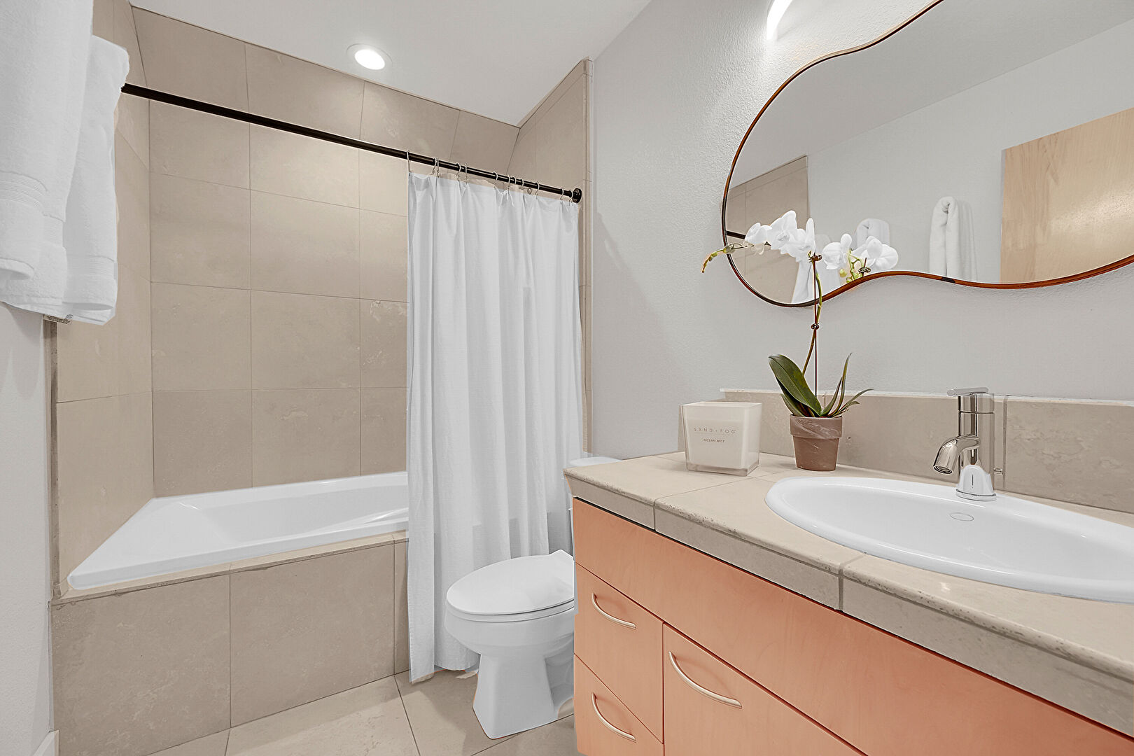 Combined Bath Shower, Drywall, Full Bathroom, Tile Floor, Vanity, Recessed Lighting