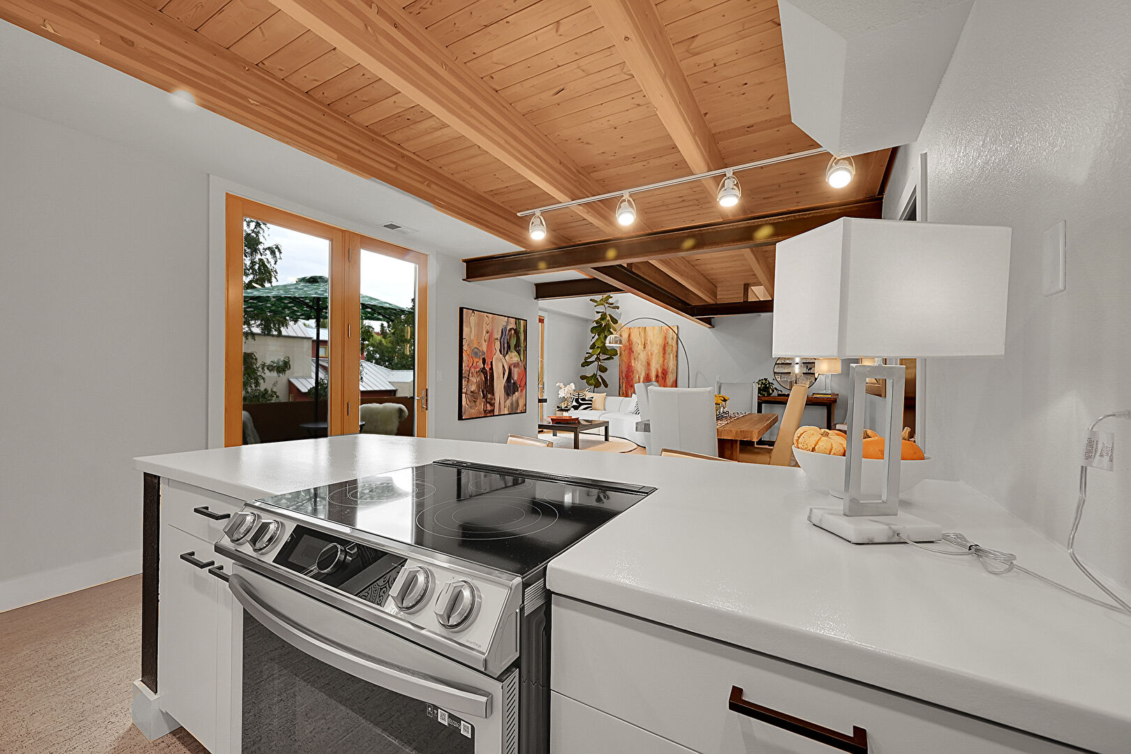 Baseboards Wall, Beamed Ceiling, Drywall, Natural Light, Track Lighting, Vent, Vinyl Floor, Wood Ceiling, Beamed Ceiling, Galley Kitchen, Natural Light