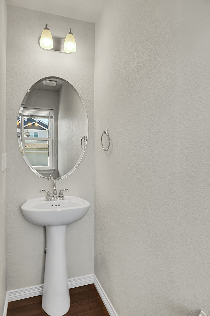 Baseboards Wall, Half Bathroom, Natural Light, Textured Wall, Water Closet, Wood Finish Floor, Baseboards Wall, Wood Finish Floor