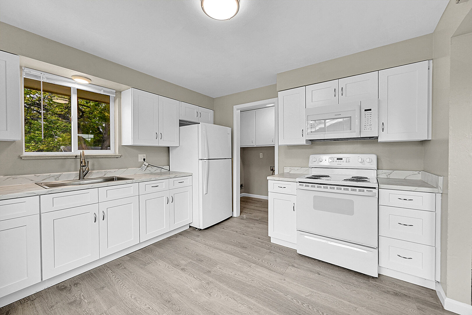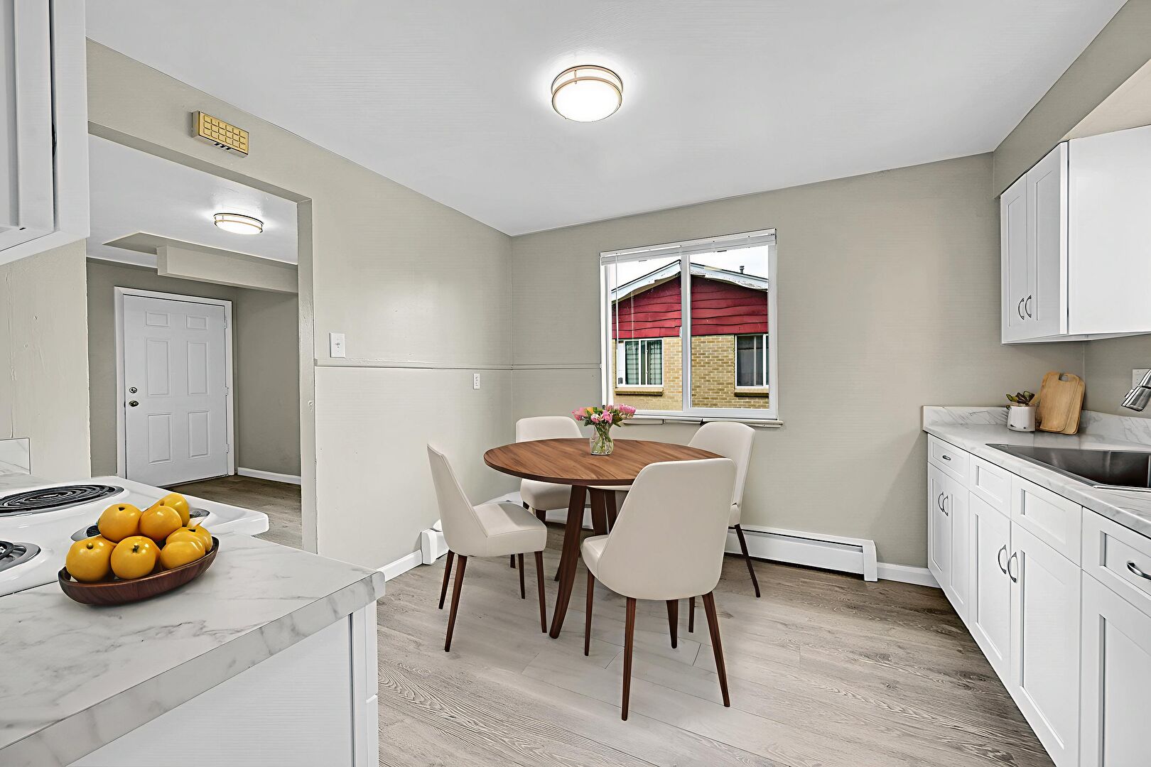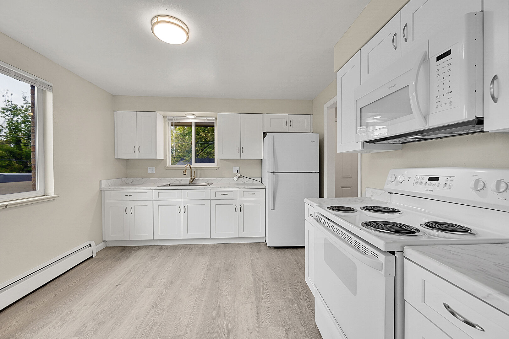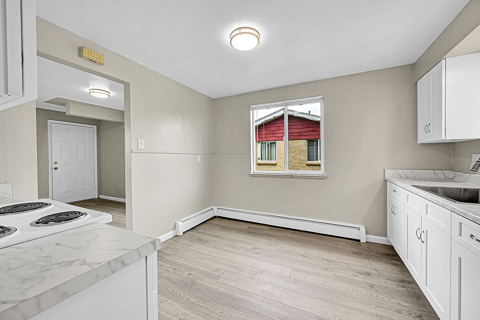 Baseboard Radiator, Baseboards Wall, Drywall, Shaker Cabinets, Wood Finish Floor, Natural Light