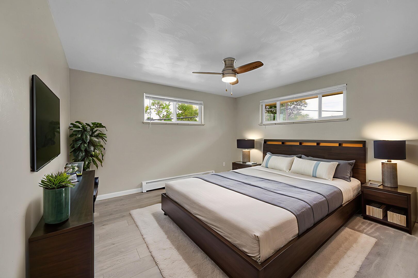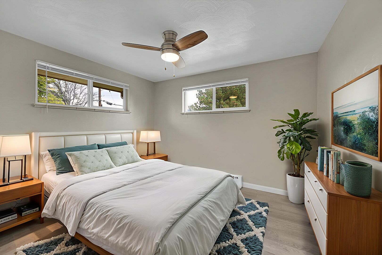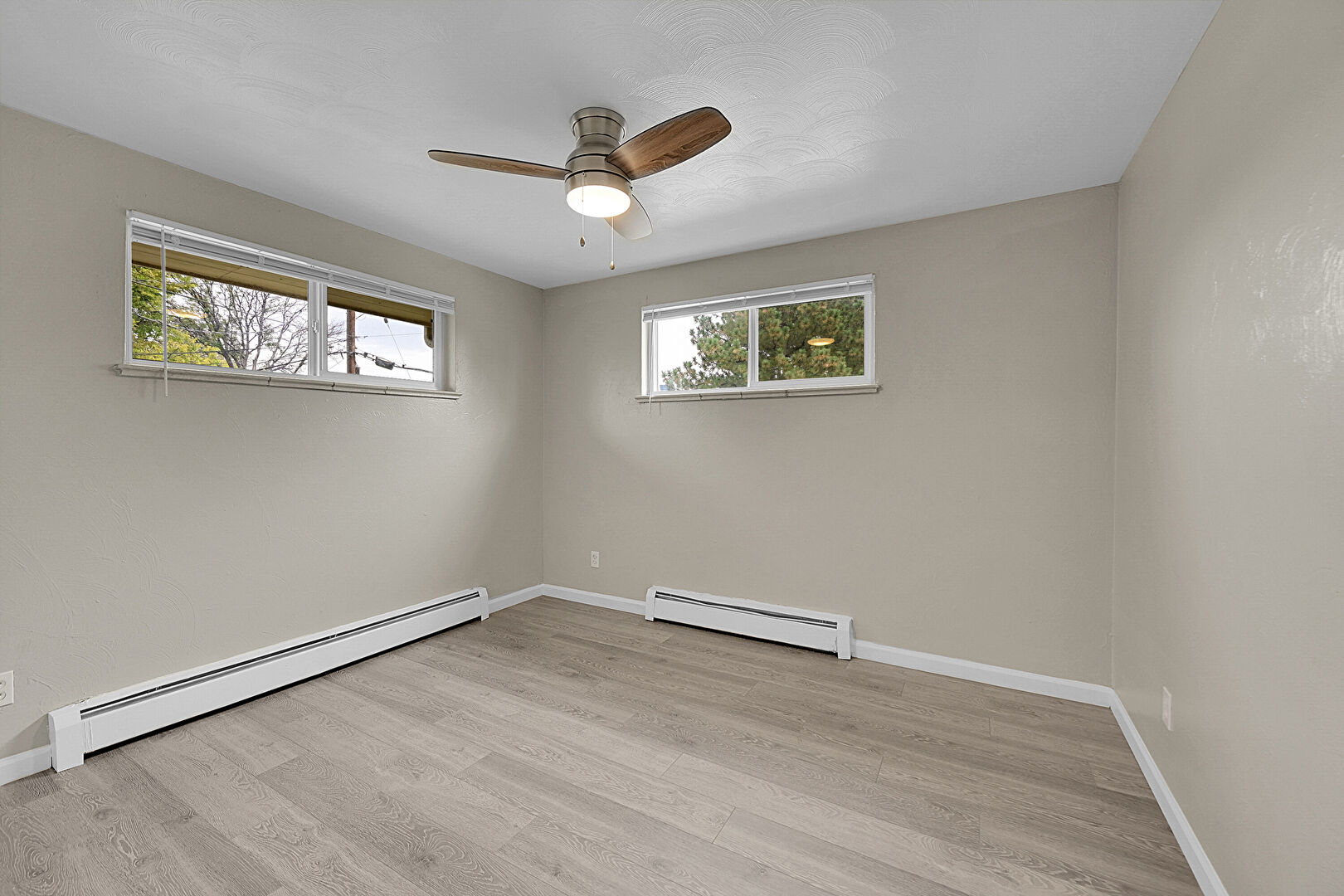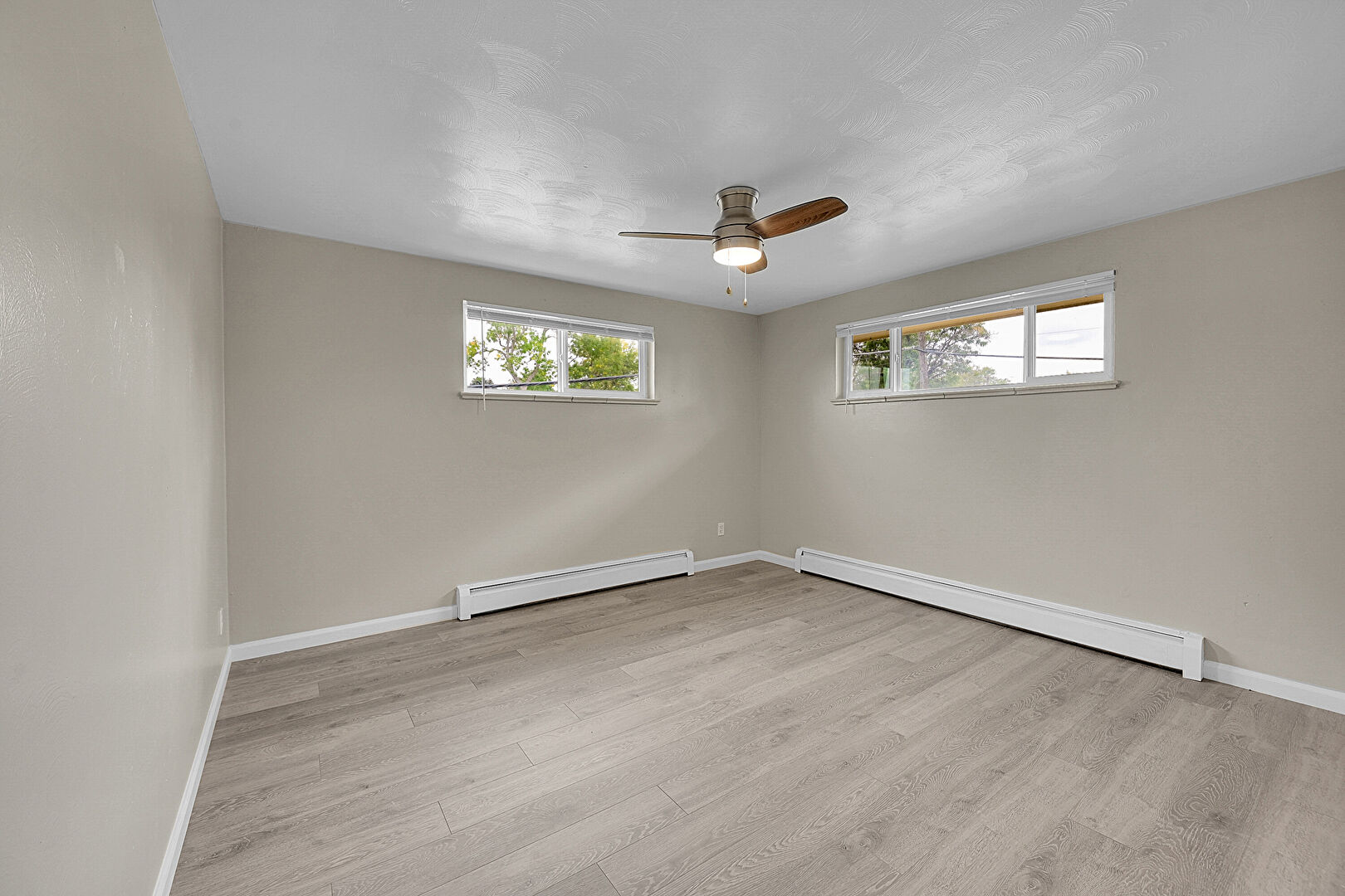 Baseboard Radiator, Baseboards Wall, Drywall, Natural Light, Wood Finish Floor, Ceiling Fan