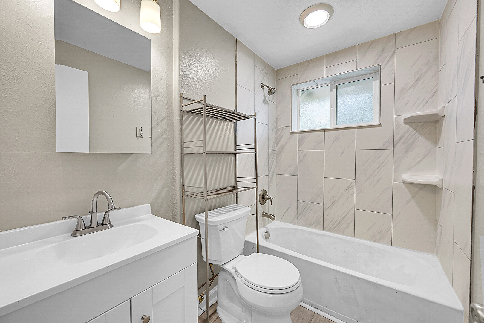 Combined Bath Shower, Full Bathroom, Natural Light, Textured Wall, Wood Finish Floor, Vanity