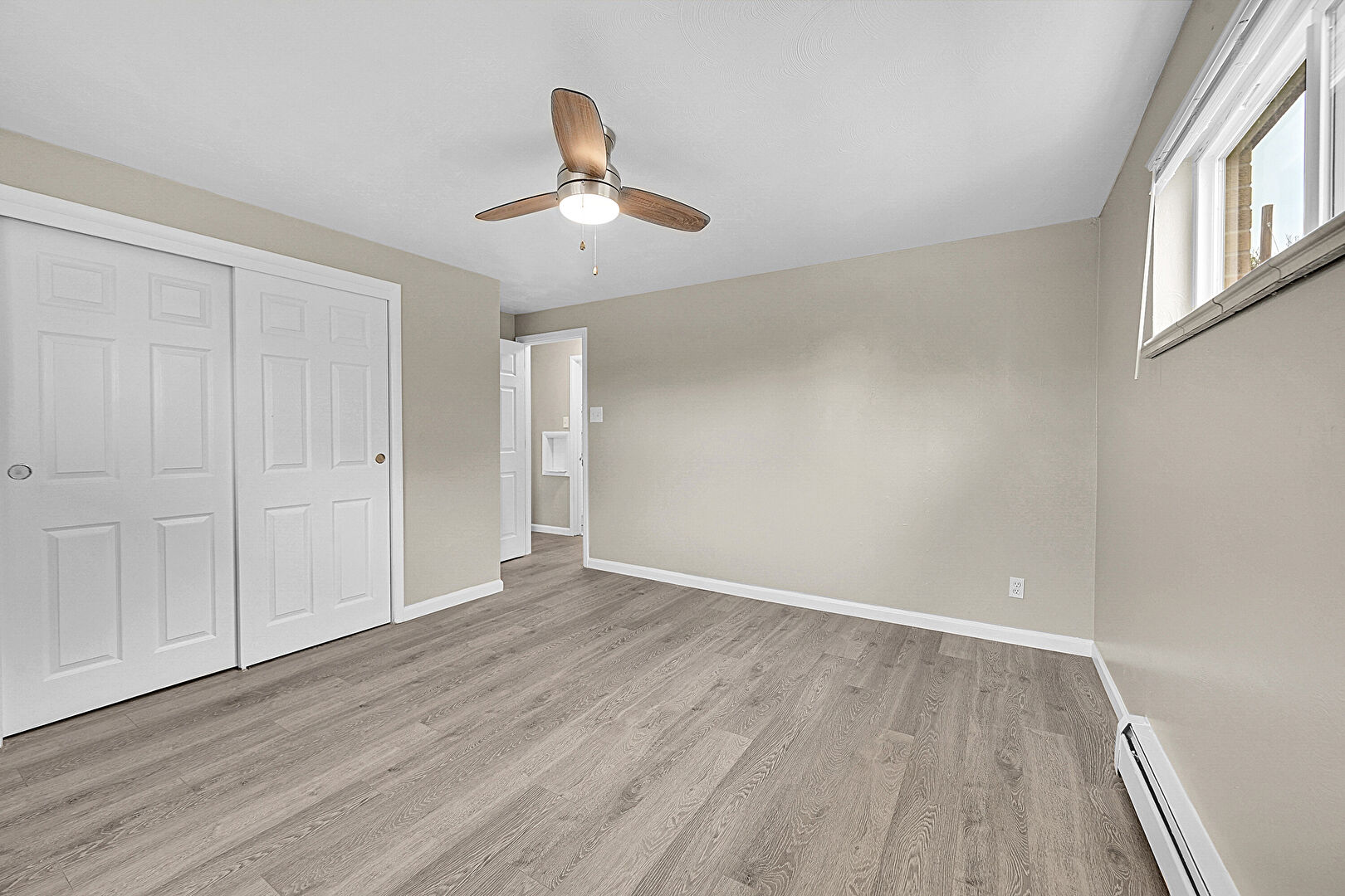 Baseboard Radiator, Baseboards Wall, Ceiling Fan, Closet, Drywall, Natural Light, Textured Ceiling, Wood Finish Floor, Drywall, Wood Finish Floor