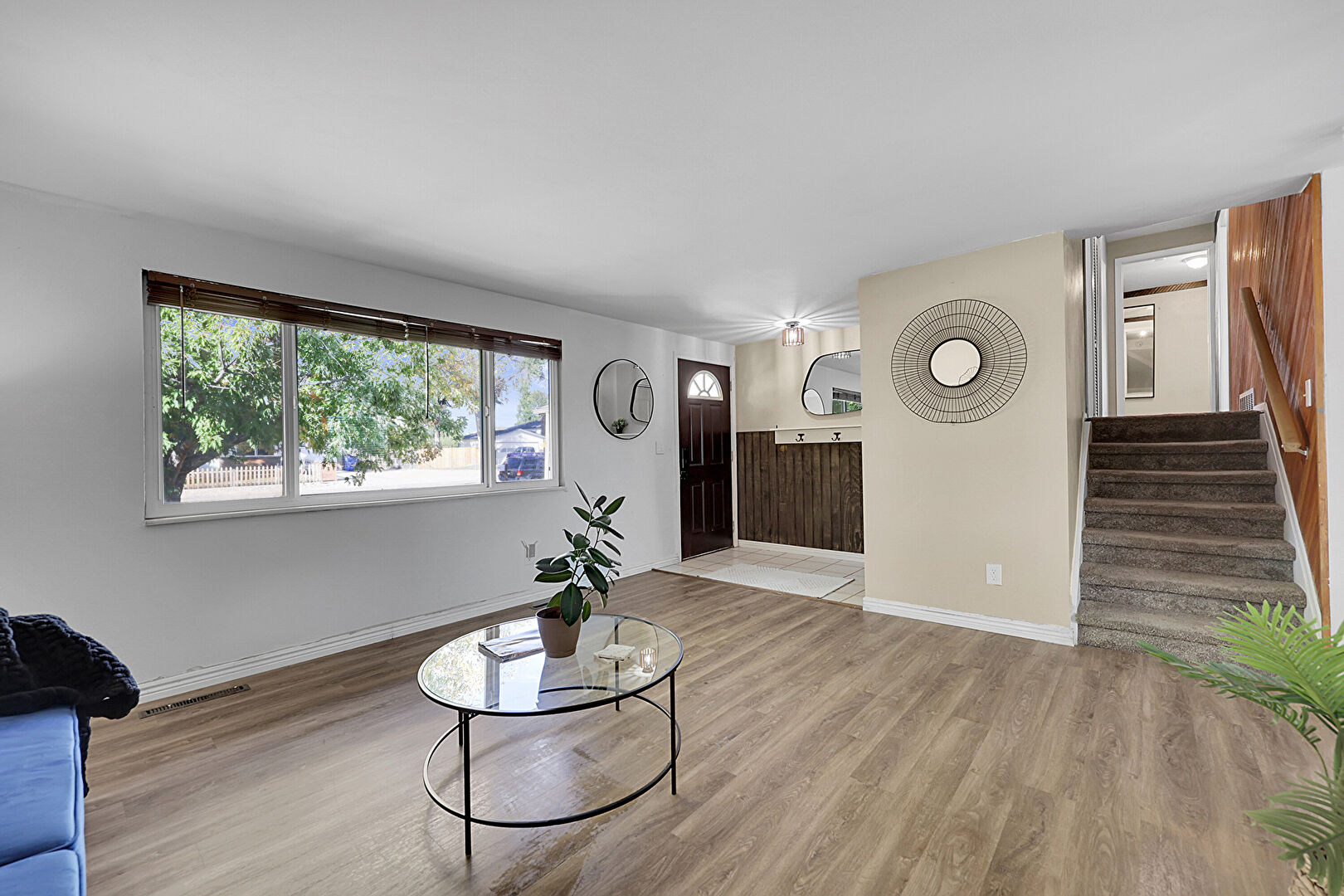 Baseboards Wall, Drywall, Natural Light, Stairs, Textured Ceiling, Vent, Wood Finish Floor, Wood Wall, Fireplace, Natural Light