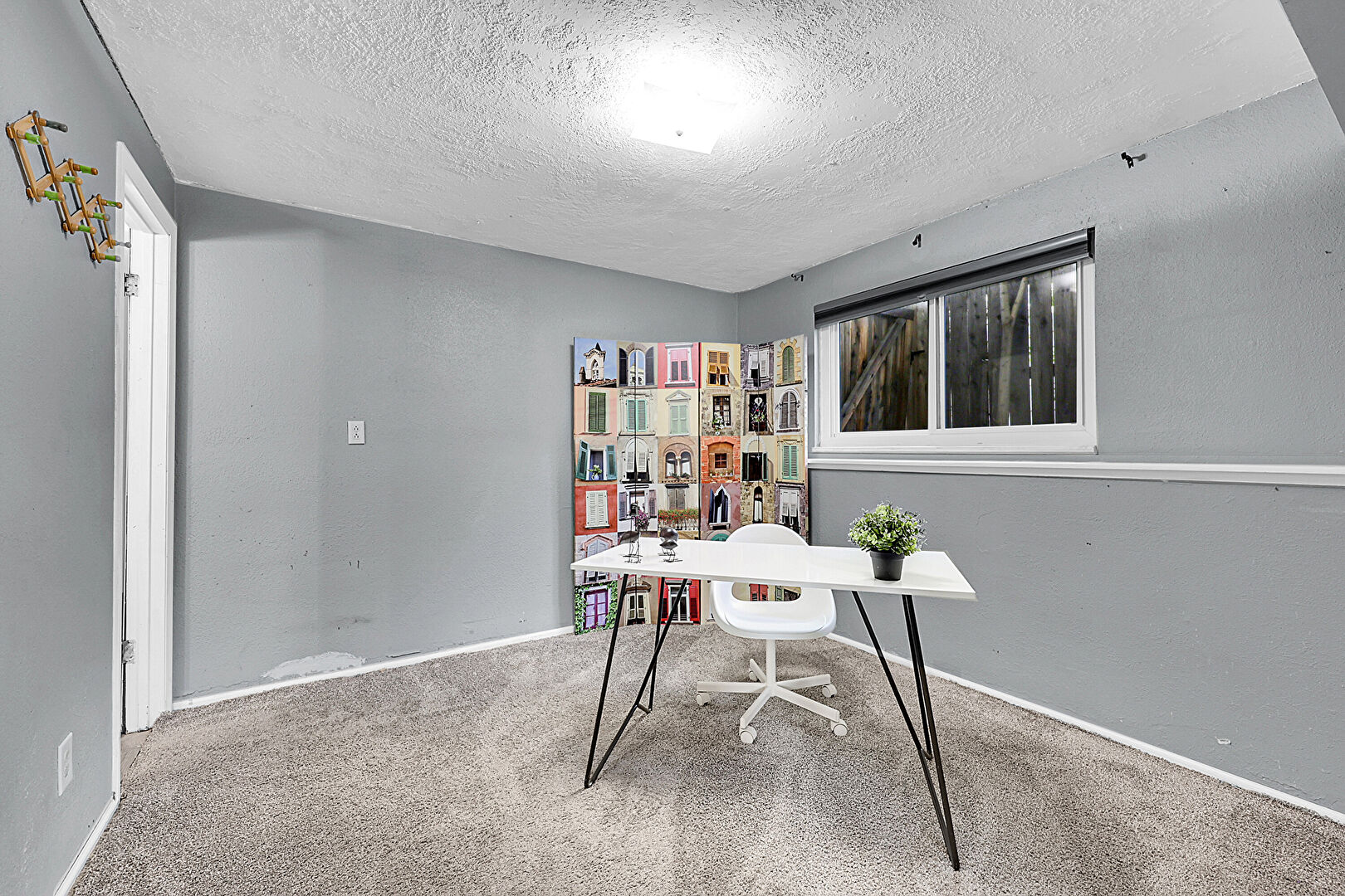 Accent Wall, Baseboards Wall, Carpet, Ceiling Fan, Drywall, Natural Light, Office Area, Textured Ceiling, Vent, Baseboards Wall, Textured Wall, Vent