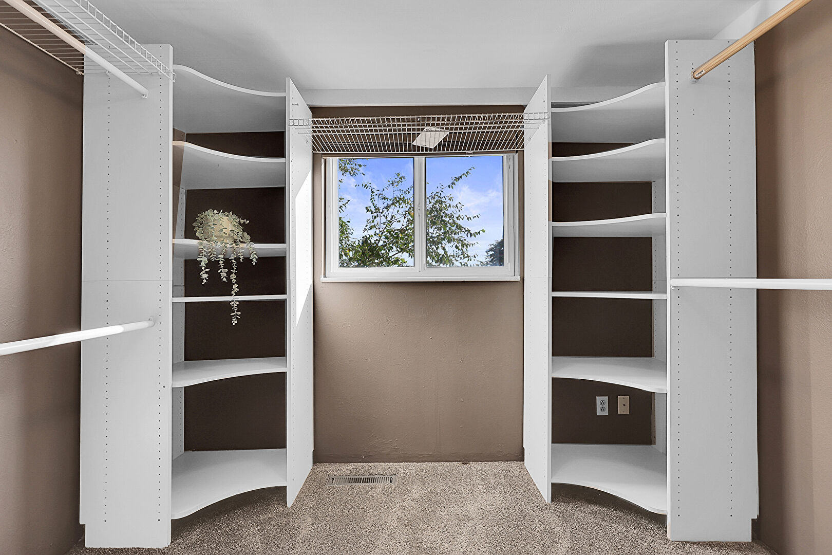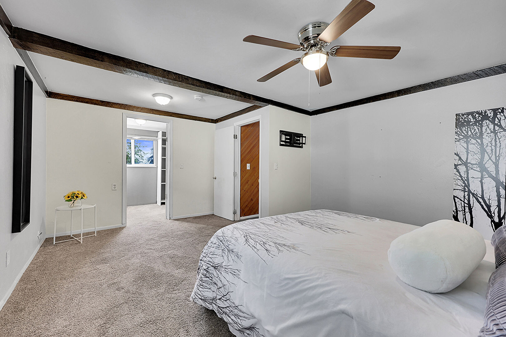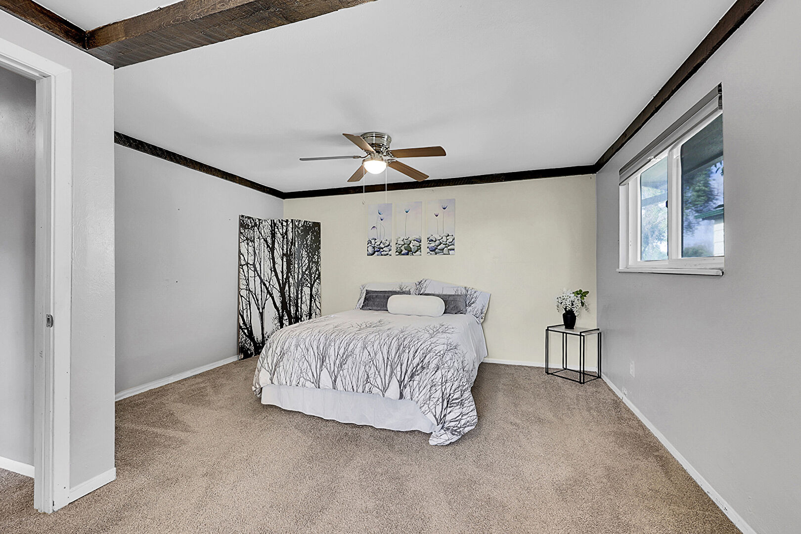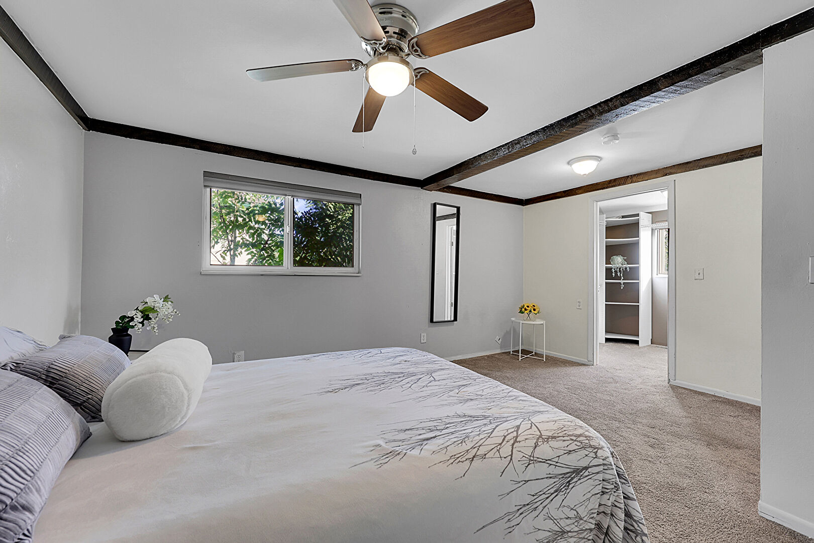 Baseboards Wall, Carpet, Ceiling Fan, Crown Molding, Drywall, Natural Light, Beamed Ceiling, Drywall