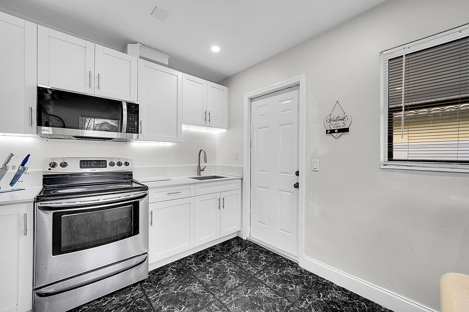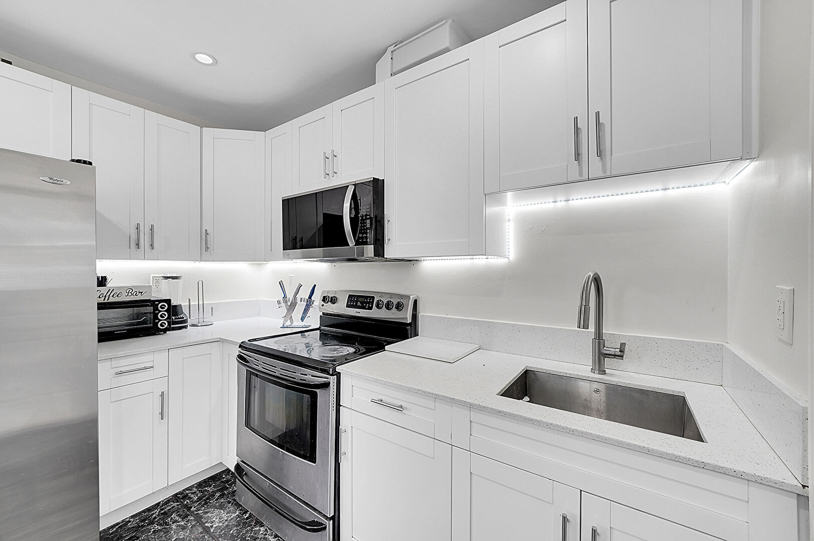 Baseboards Wall, Drywall, Natural Light, Recessed Lighting, Shaker Cabinets, Stone Countertops, Tile Floor, Vent, Baseboards Wall, Toaster
