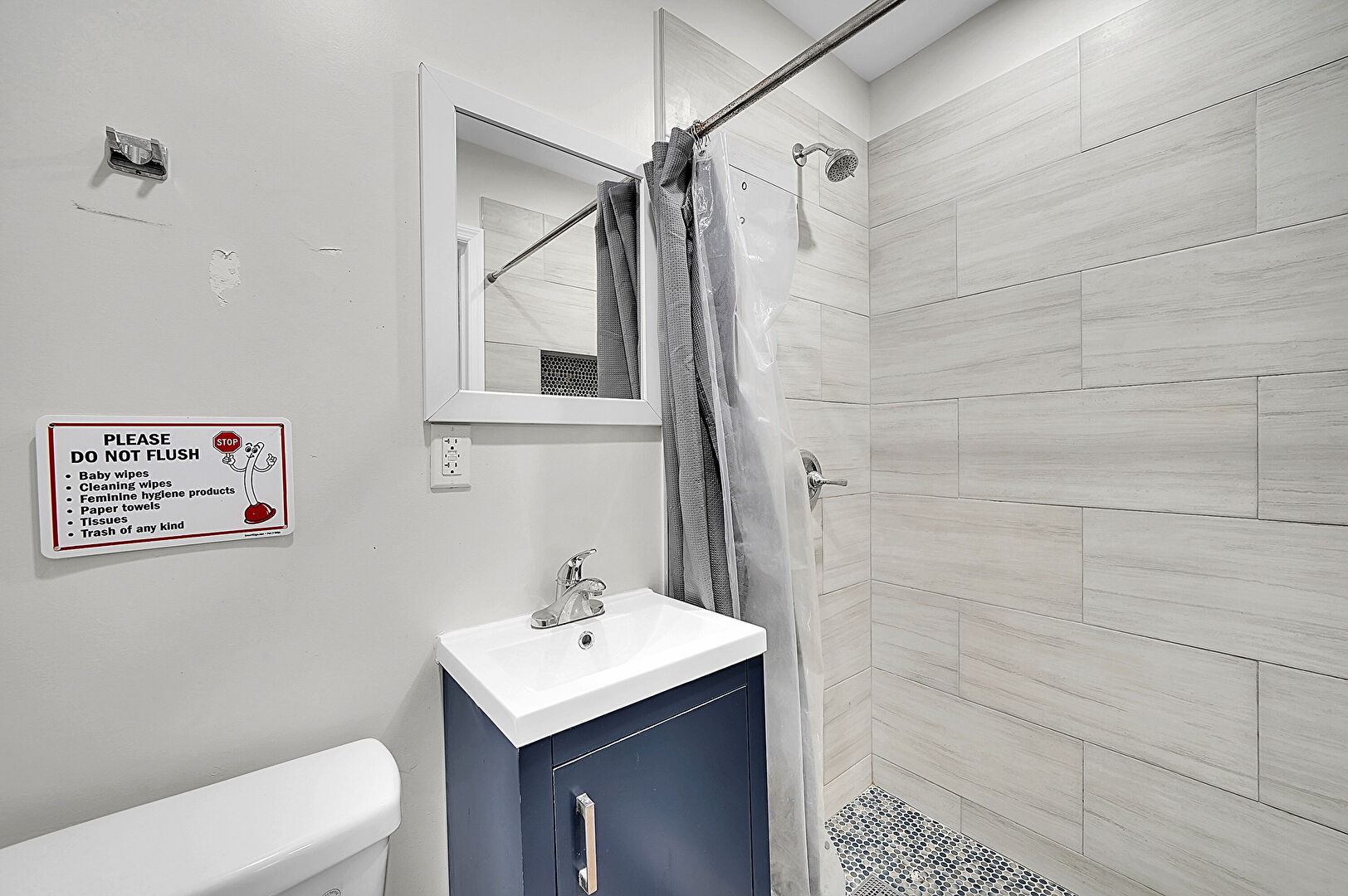 Combined Bath Shower, Drywall, Natural Light, Recessed Lighting, Tile Floor, Tile Wall, Vanity, Full Bathroom