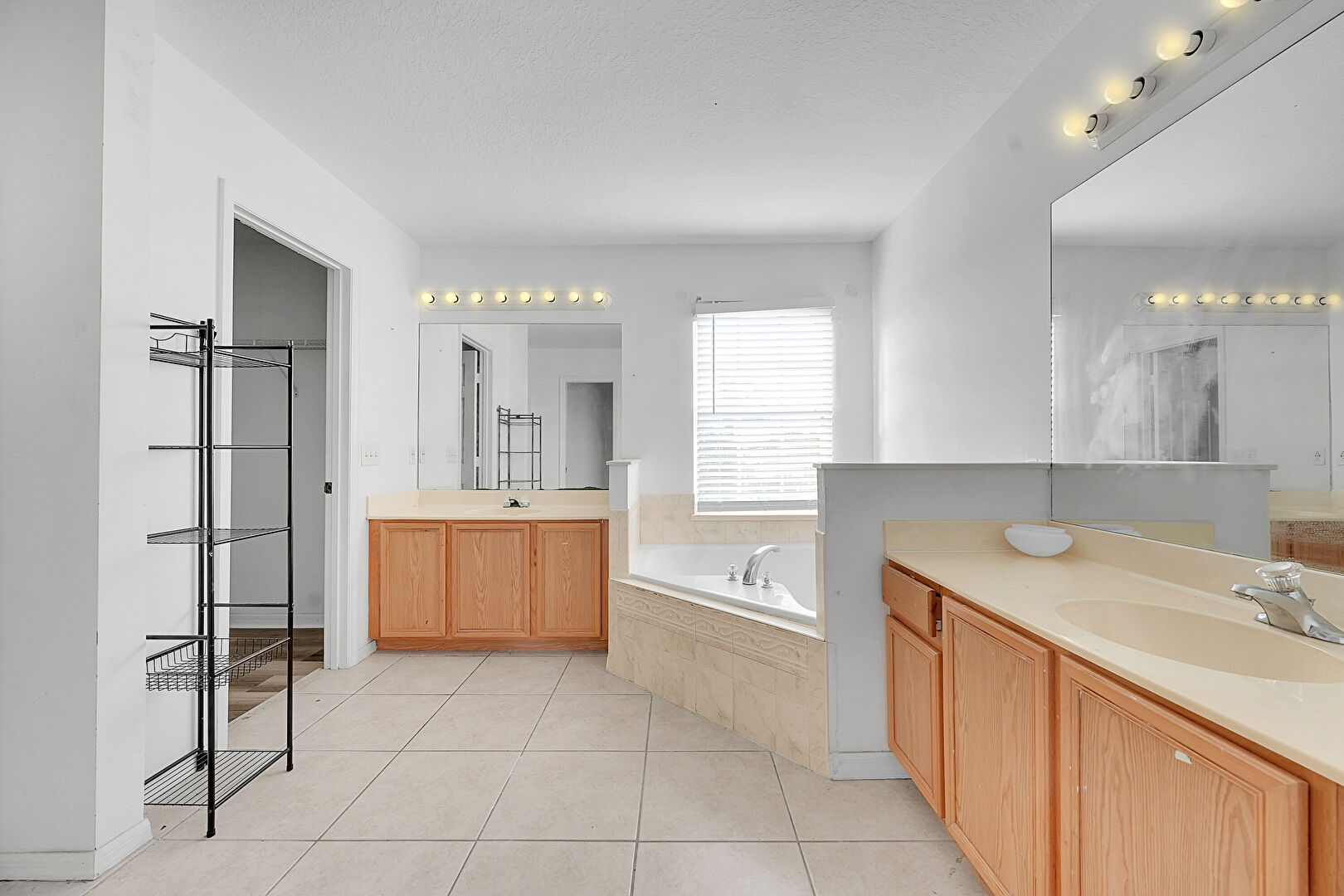 Closet, Drywall, Full Bathroom, Natural Light, Textured Ceiling, Tile Floor, Two Single Vanities, Drywall, Vanity