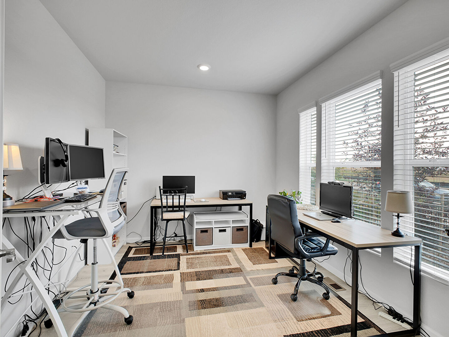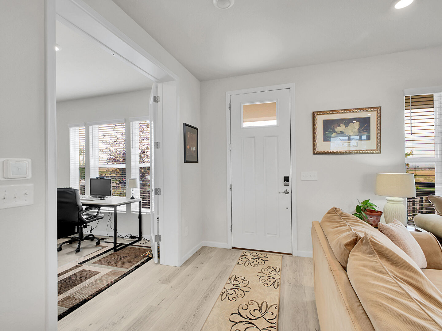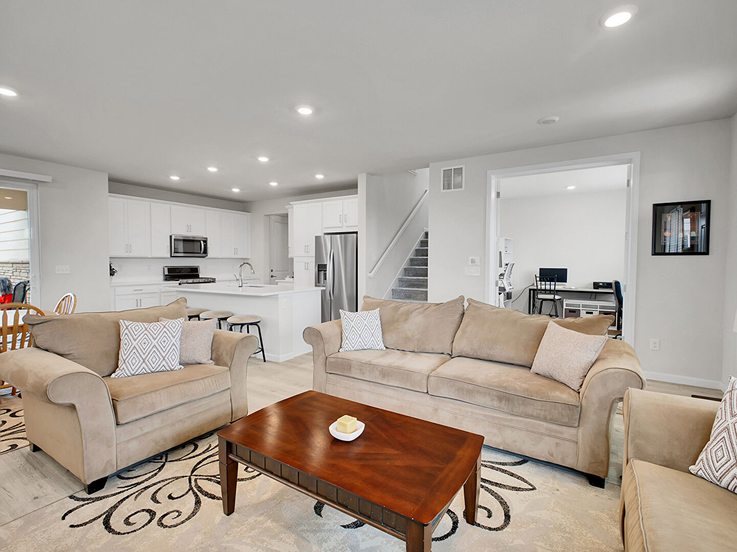 Baseboards Wall, Drywall, L Shaped Kitchen, Natural Light, Office Area, Recessed Lighting, Stairs, Vent, Wood Finish Floor, Carpet, Drywall, Recessed Lighting