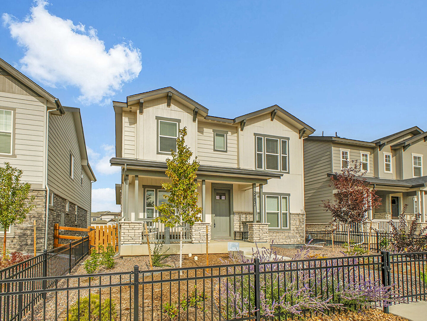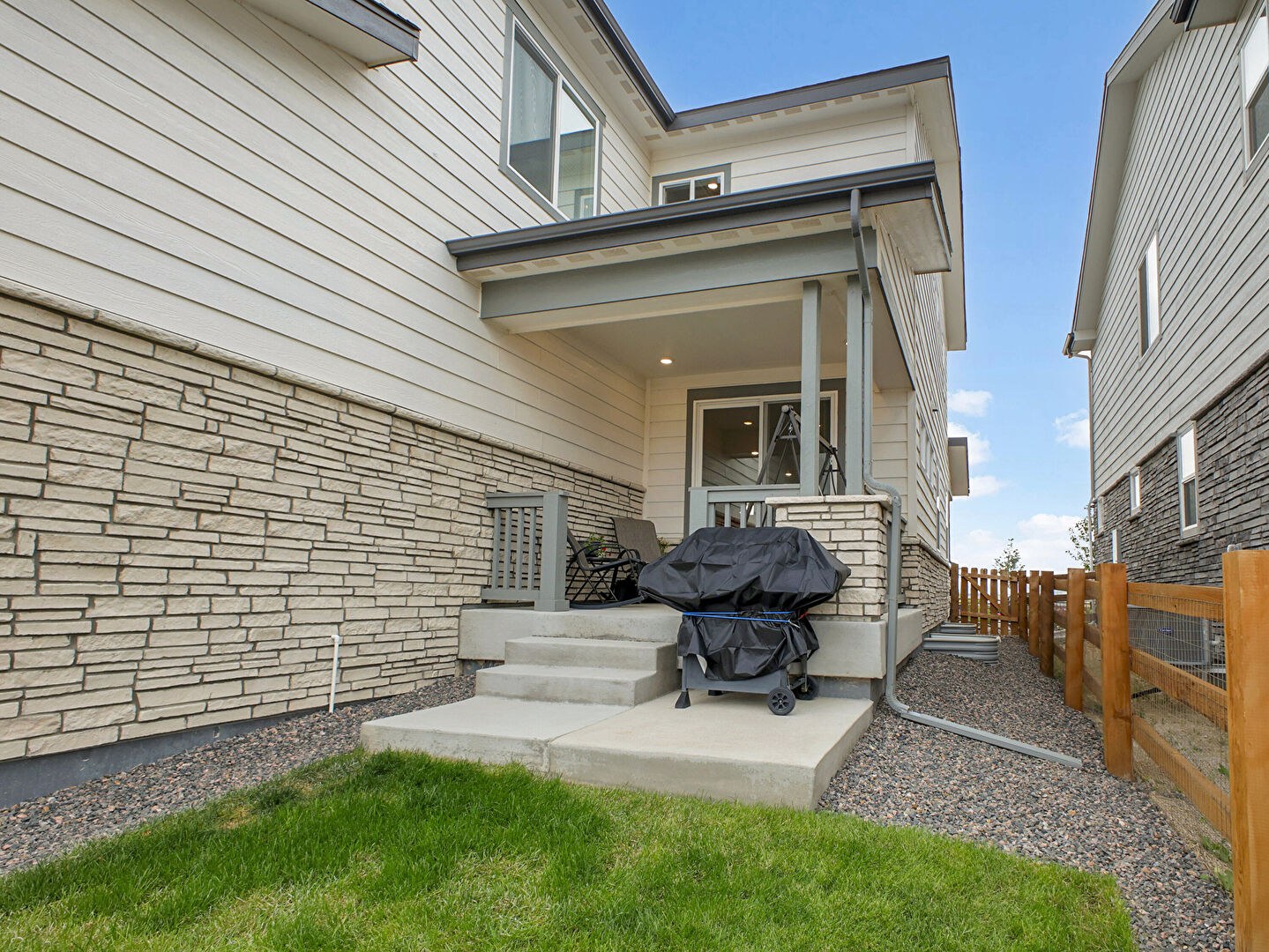 Board Batten Siding, Concrete Foundation, Downspout, Fence, Gate, Gutters, Horizontal Siding, Porch, Stone Siding, Stucco Siding, Vertical Siding, Fence, Vertical Siding