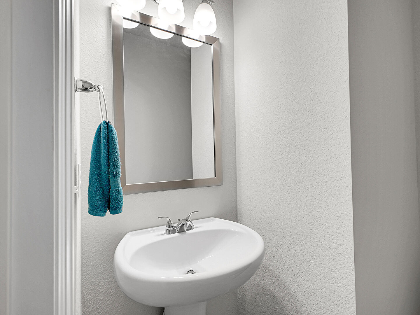 Baseboards Wall, Drywall, Full Bathroom, Half Bathroom, Natural Light, Textured Wall, Tile Floor, Vanity, Wood Finish Floor, Baseboards Wall, Combined Bath Shower, Notable Chandelier