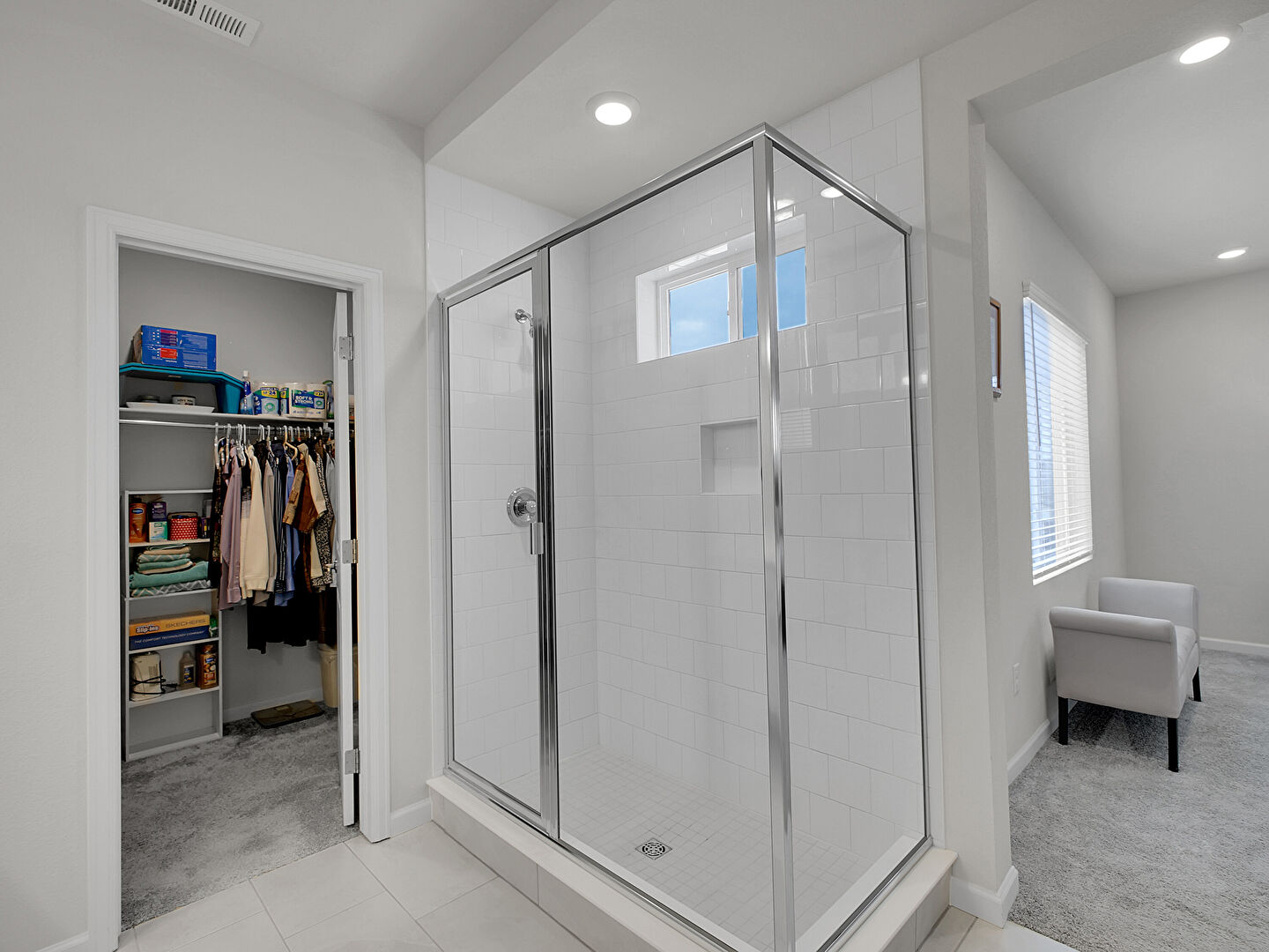 Baseboards Wall, Carpet, Double Vanity, Drywall, Ensuite Bathroom, Full Bathroom, Natural Light, Recessed Lighting, Tile Floor, Vent, Walk In Closet, Drywall, Full Bathroom, Tile Floor