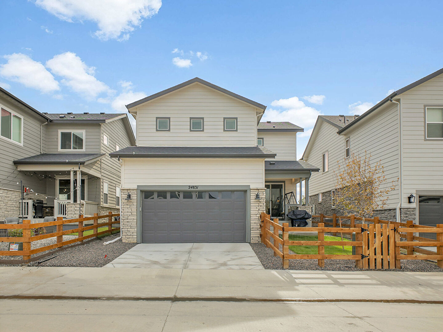 Built In Garage, Fence, Grill, Horizontal Siding, Porch, Shingle Roof, Stone Siding, Driveway