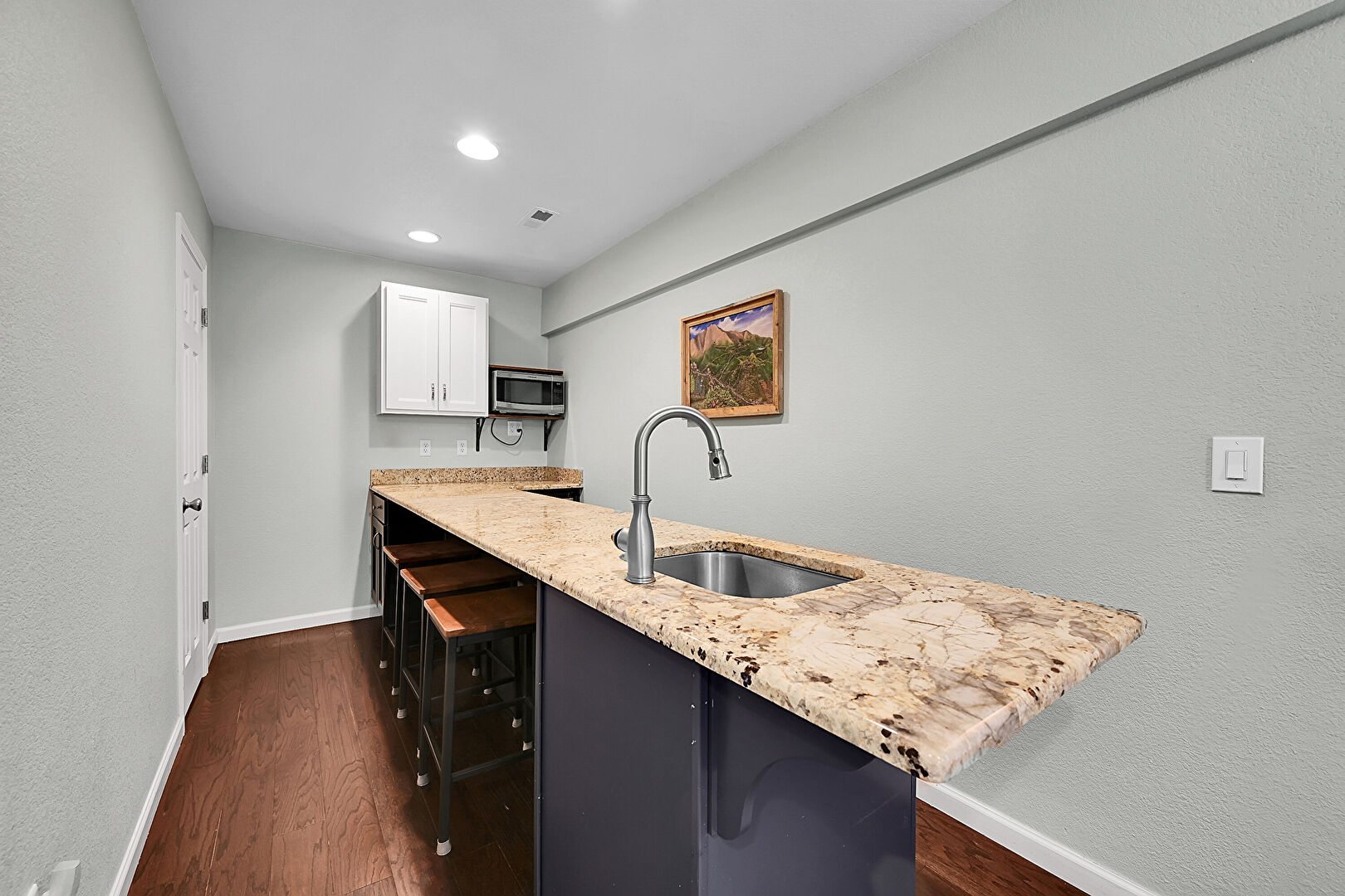 Baseboards Wall, Drywall, Kitchen Bar, Kitchen Peninsula, Recessed Lighting, Shaker Cabinets, Stone Countertops, Vent, Wood Finish Floor, Textured Wall, Vent