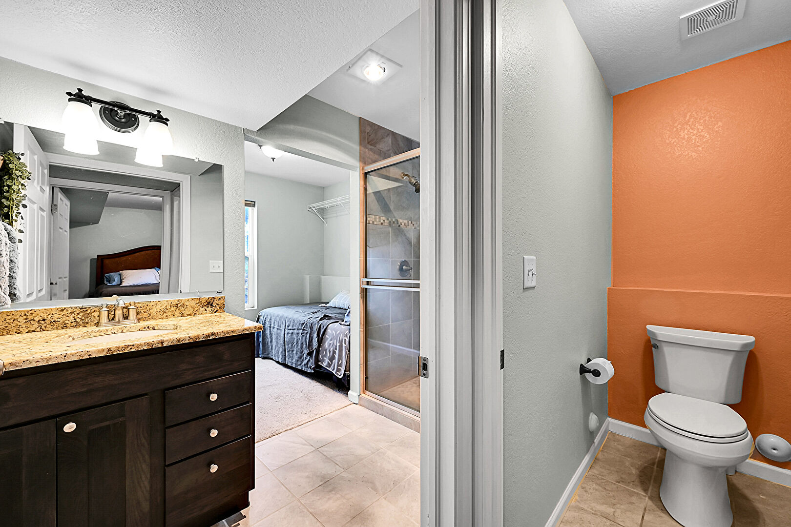 Baseboards Wall, Carpet, Ensuite Bathroom, Full Bathroom, Natural Light, Textured Ceiling, Textured Wall, Tile Floor, Vanity, Drywall, Vent