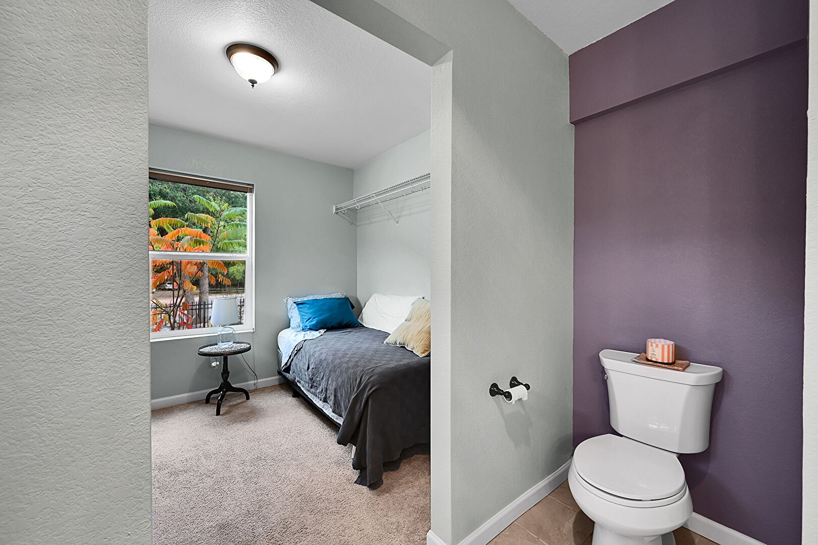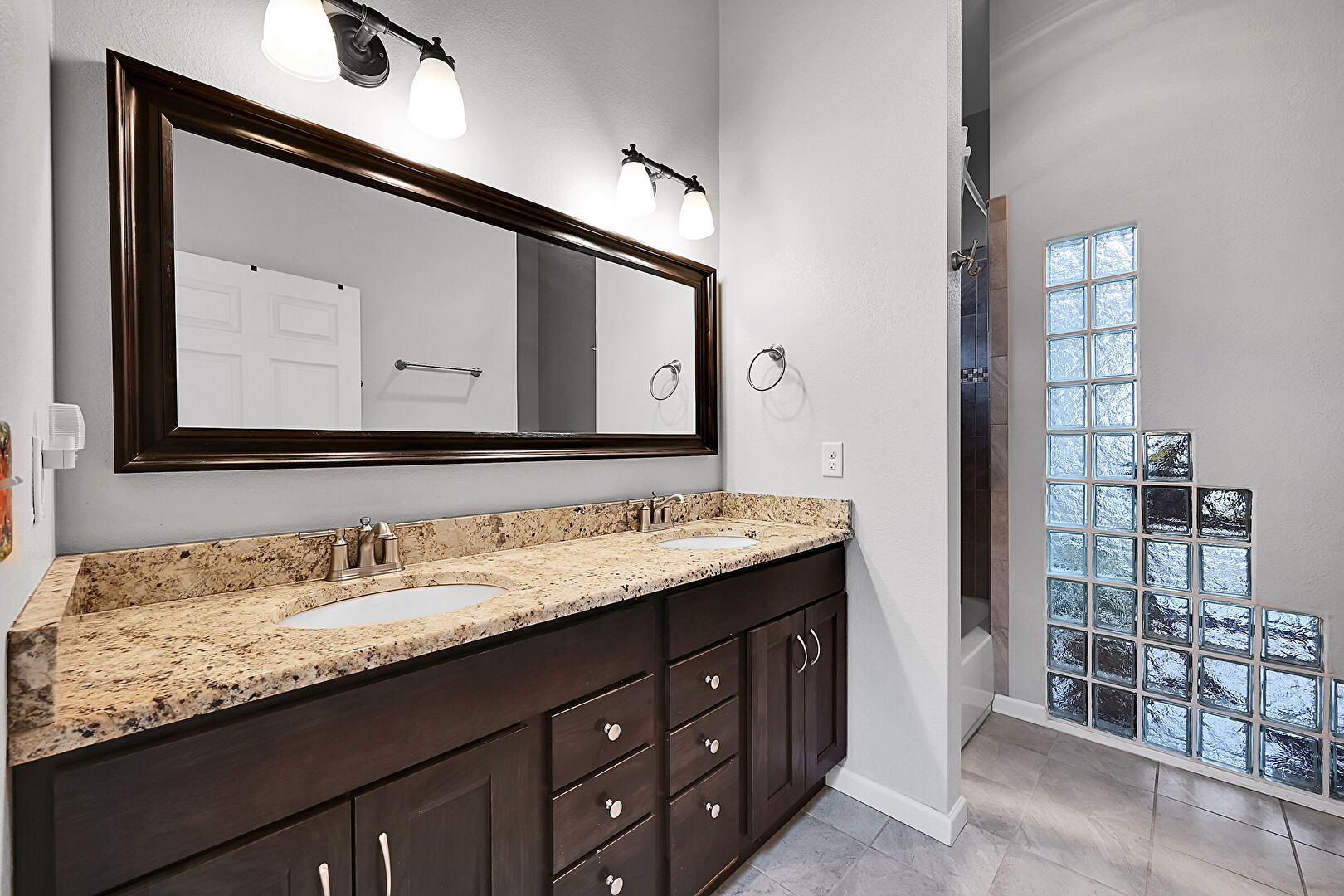 Baseboards Wall, Carpet, Combined Bath Shower, Full Bathroom, Natural Light, Textured Ceiling, Textured Wall, Tile Floor, Double Vanity, Natural Light