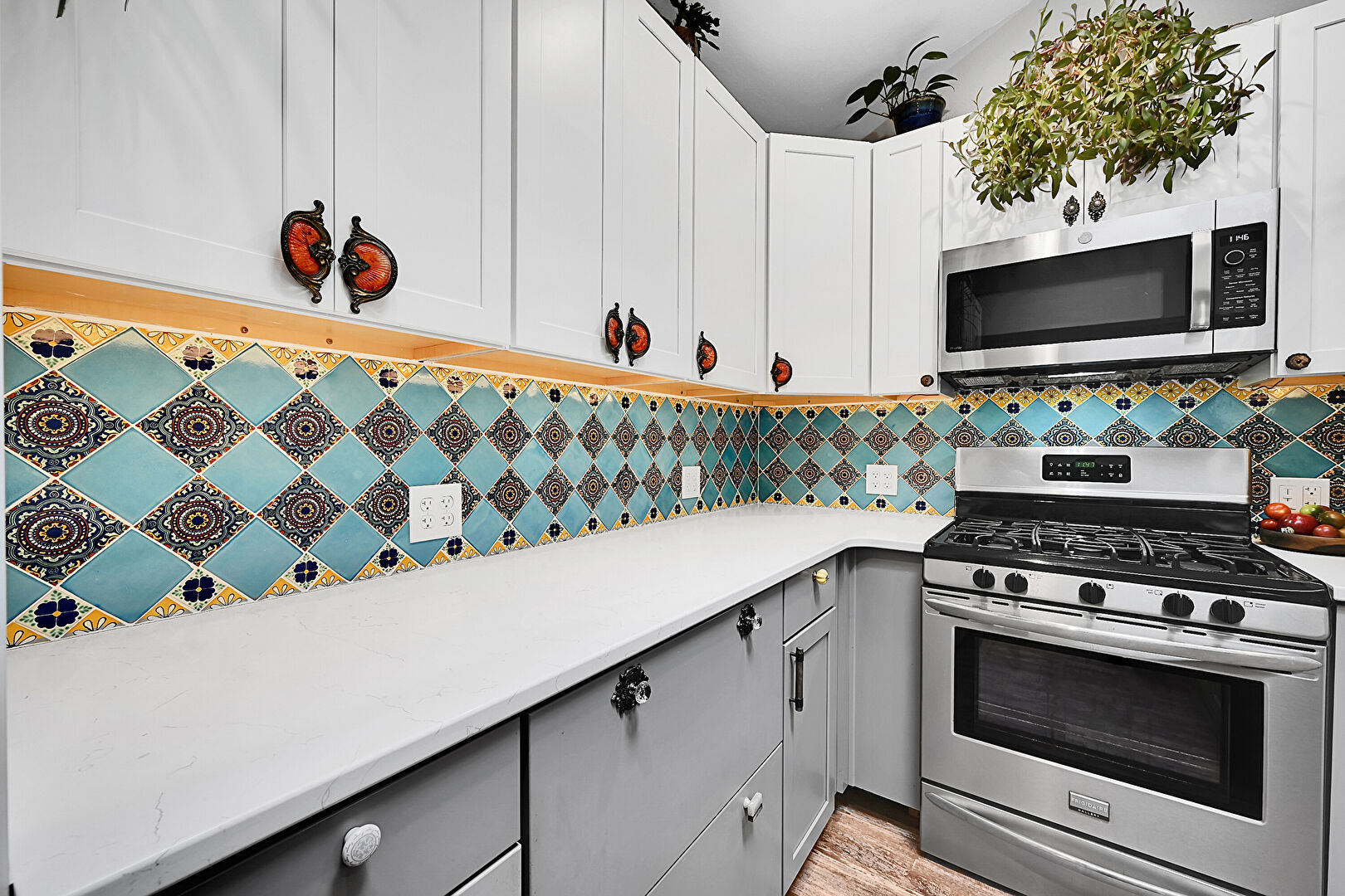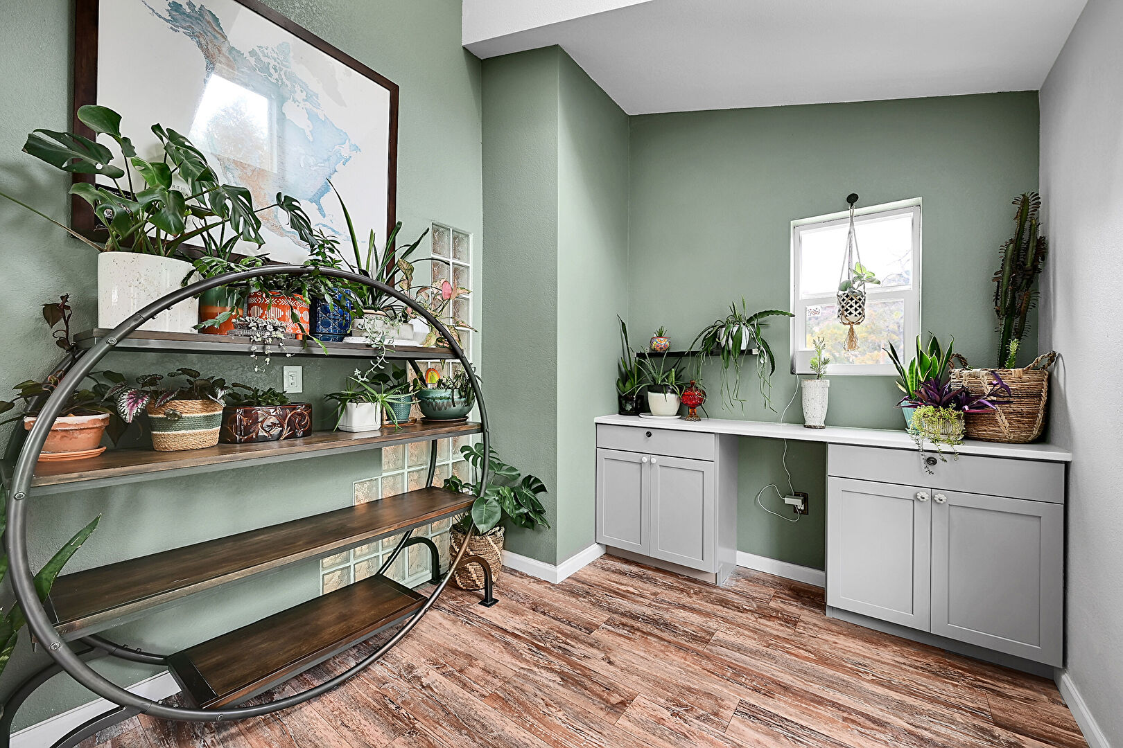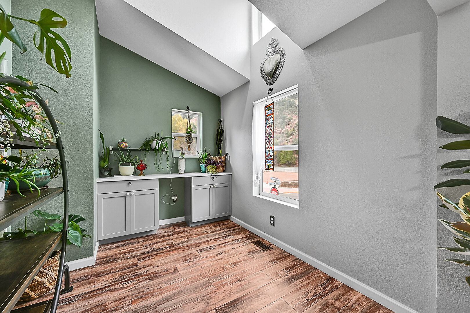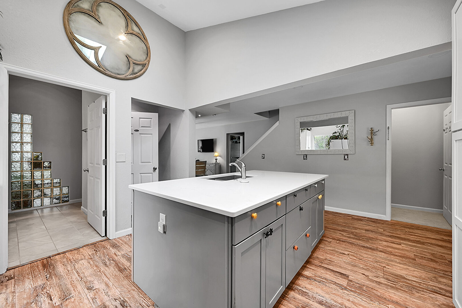 Barn Door, Baseboards Wall, Drywall, Gray Cabinets, High Ceiling, Natural Light, Shaker Cabinets, Stone Countertops, Textured Wall, Vaulted Ceiling, Vent, Wood Finish Floor, Baseboards Wall, Vaulted Ceiling, Wood Finish Floor