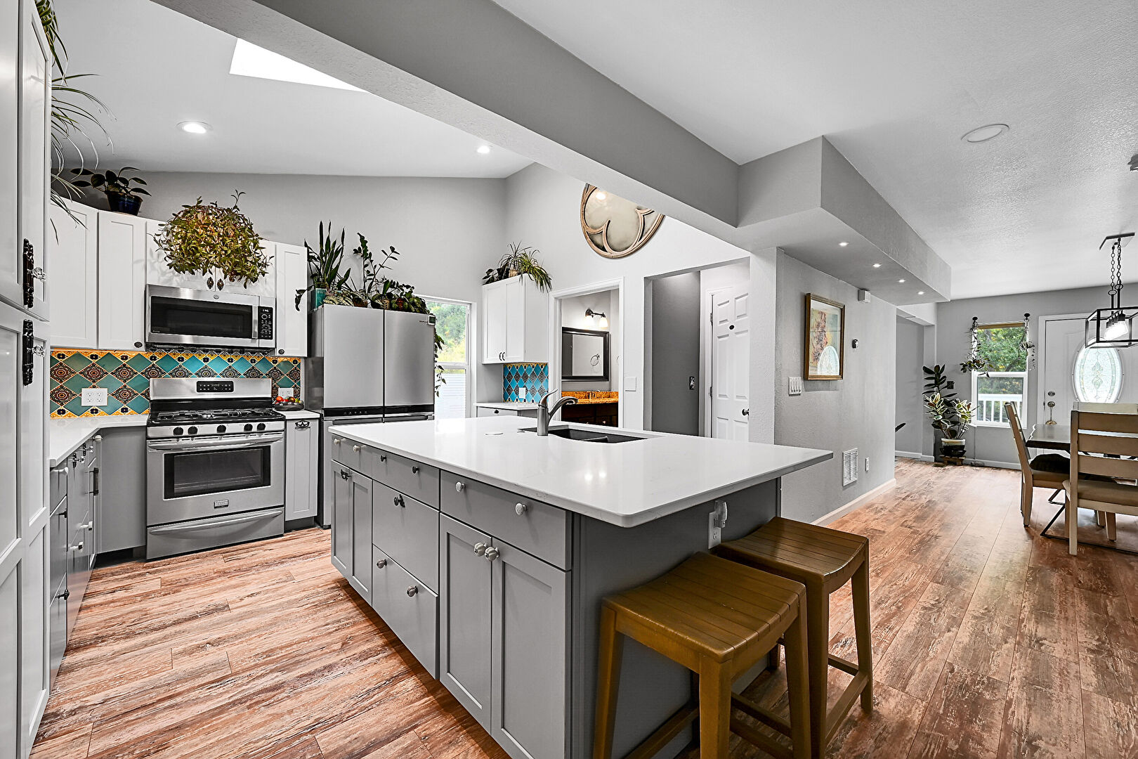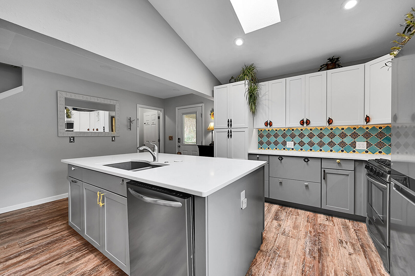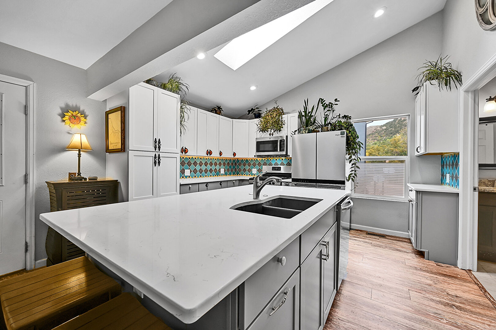 Baseboards Wall, Drywall, Gray Cabinets, High Ceiling, Kitchen Bar, Kitchen Island, Natural Light, Opens To Living Area, Pendant Lighting, Recessed Lighting, Shaker Cabinets, Skylight, Stone Countertops, Vaulted Ceiling, Wood Finish Floor, Baseboards Wall, Gray Cabinets, Natural Light, Recessed Lighting, Vaulted Ceiling, Wood Finish Floor