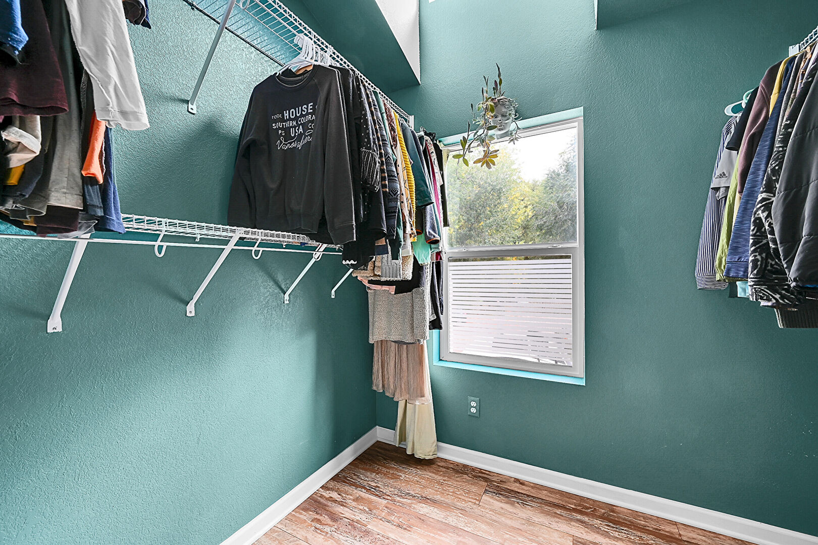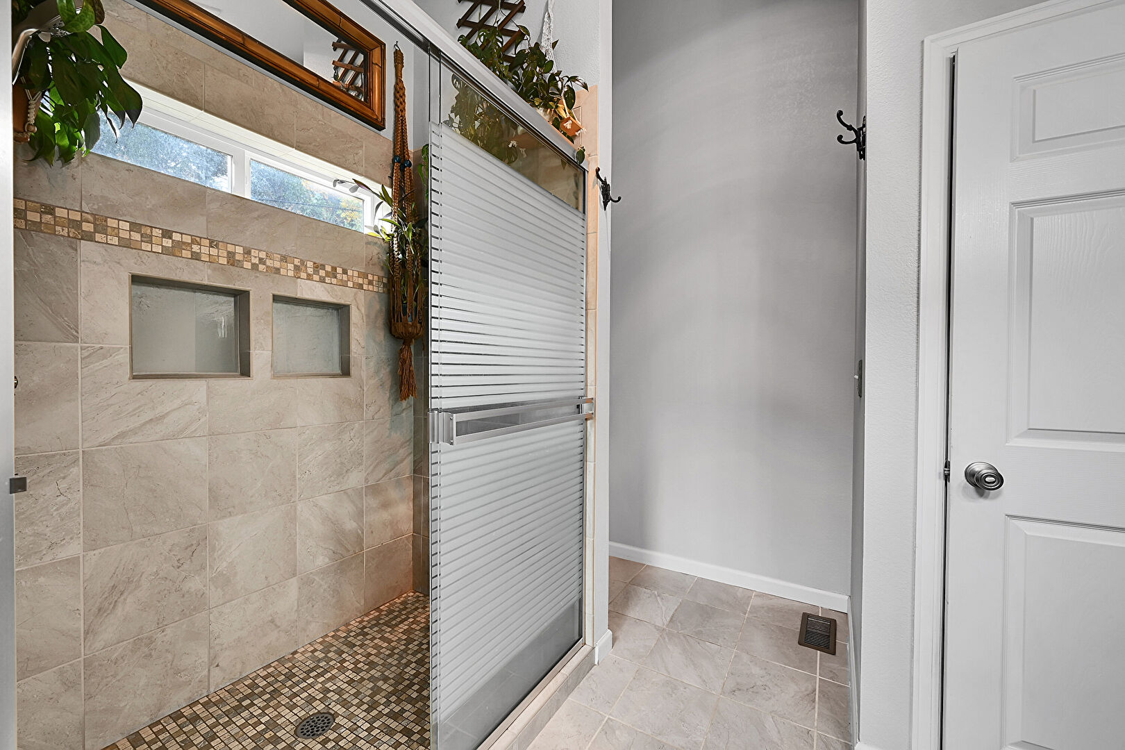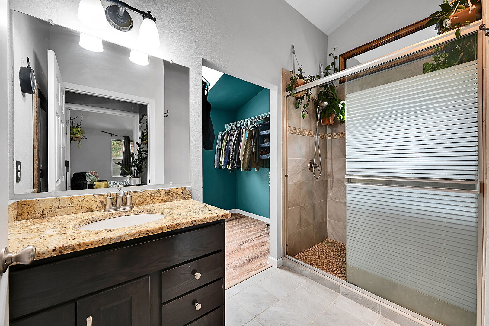 Baseboards Wall, Drywall, Full Bathroom, Natural Light, Tile Floor, Vanity, Vaulted Ceiling, Walk In Closet, Wood Finish Floor, Full Bathroom, Natural Light
