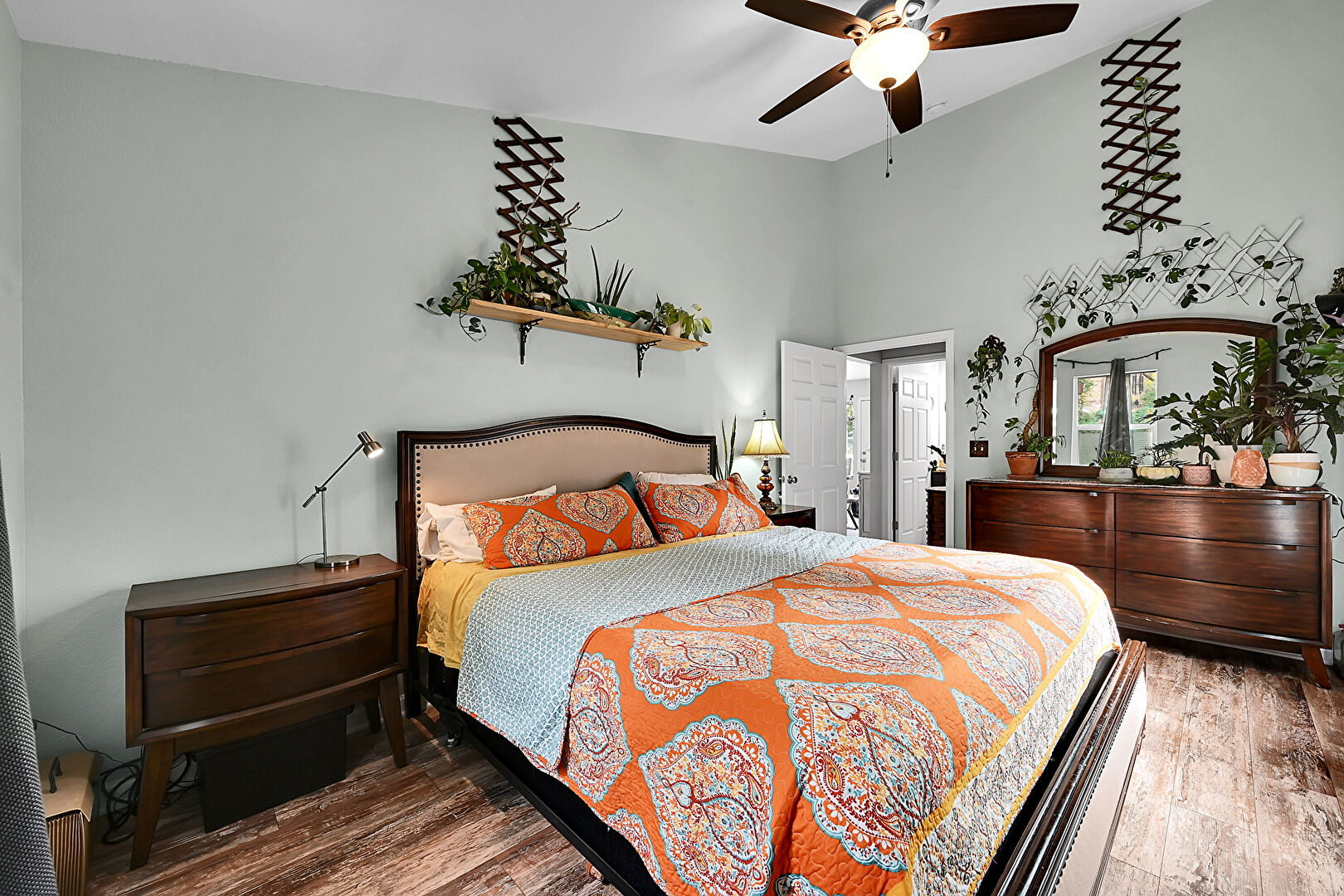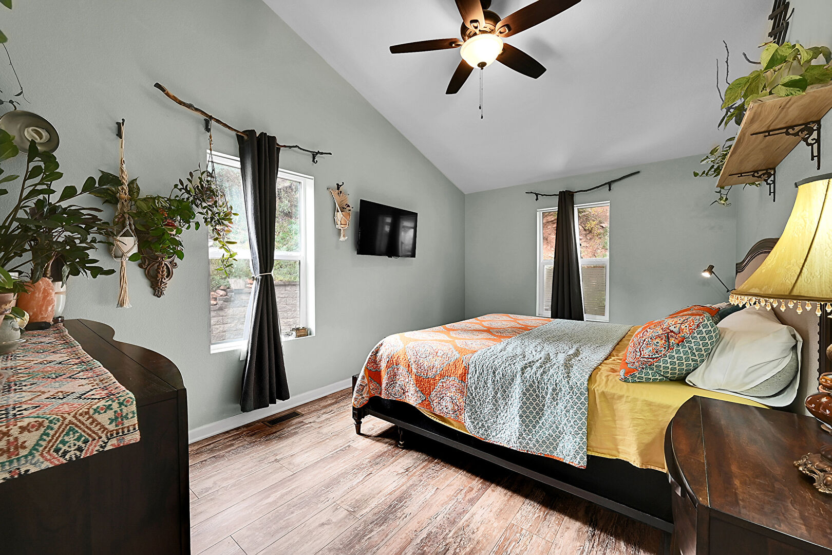 Baseboards Wall, Ceiling Fan, Drywall, High Ceiling, Natural Light, Vent, Wood Finish Floor, Drywall, Vaulted Ceiling