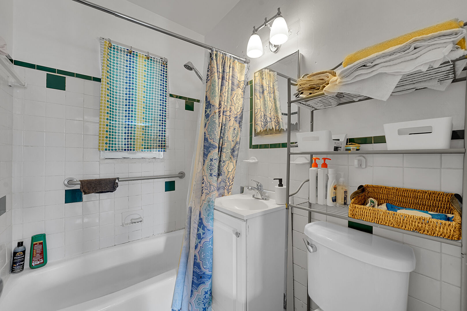 Combined Bath Shower, Drywall, Full Bathroom, Vanity, Natural Light, Tile Wall