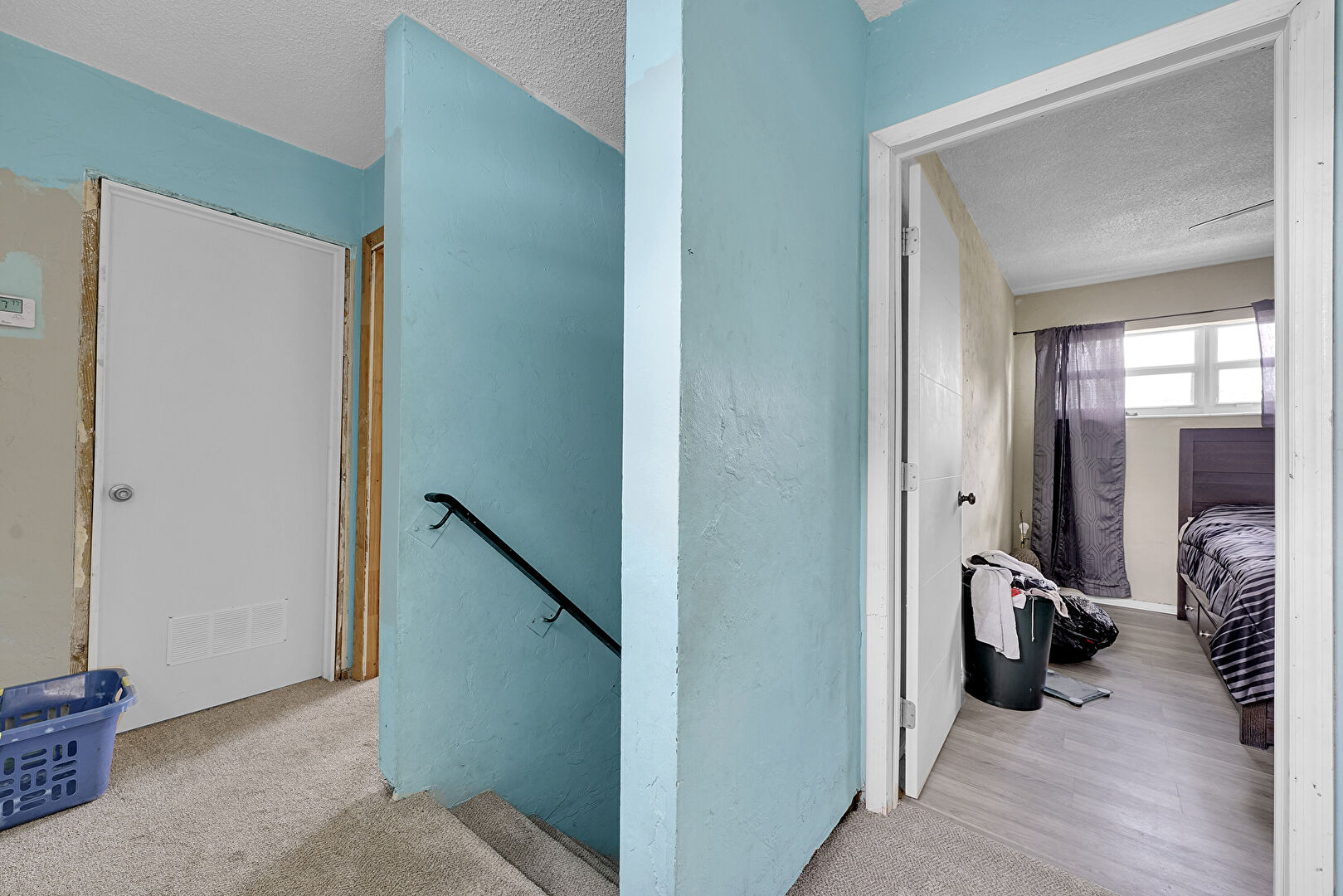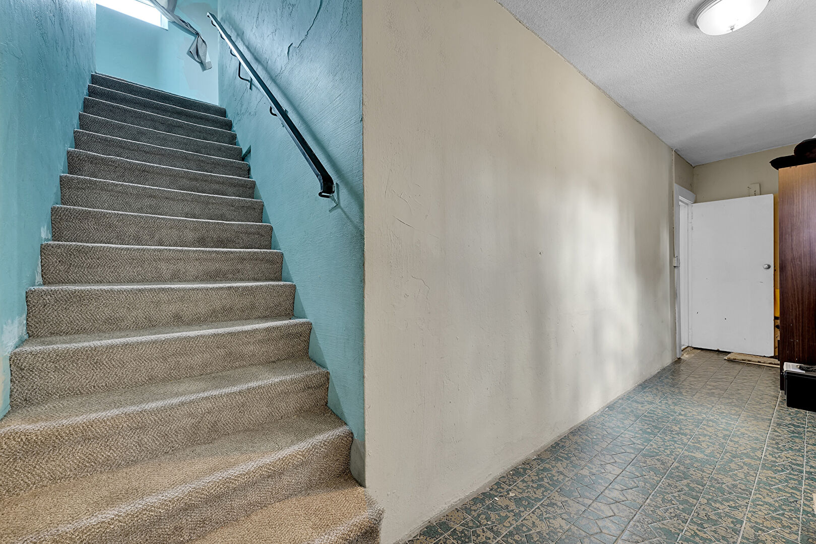 Stairs, Textured Ceiling, Vinyl Floor, Drywall