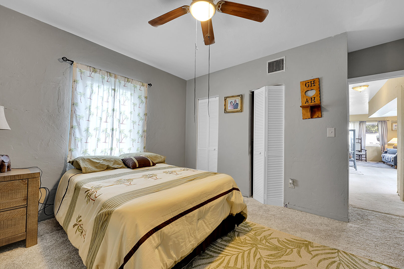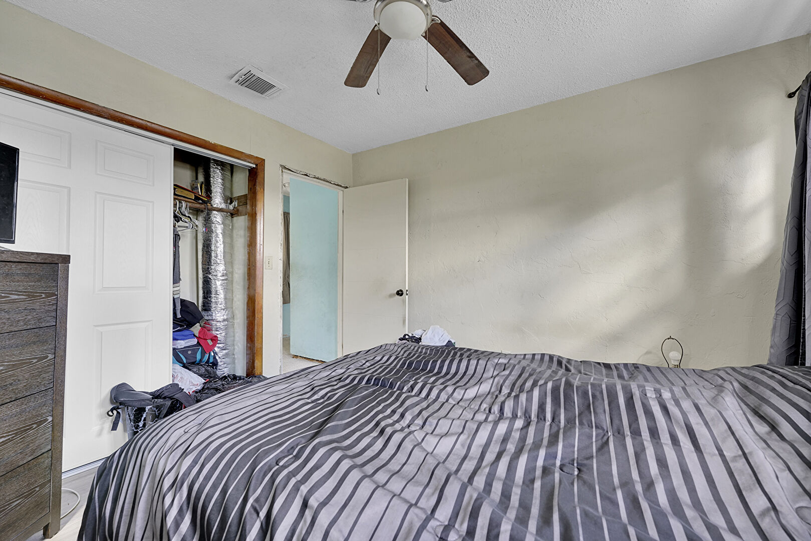 Baseboards Wall, Carpet, Ceiling Fan, Closet, Drywall, Natural Light, Office Area, Textured Ceiling, Textured Wall, Two Closets, Vent, Wood Finish Floor, Carpet, Ceiling Fan, Drywall, Textured Ceiling
