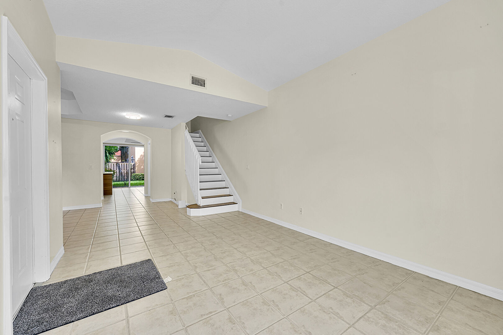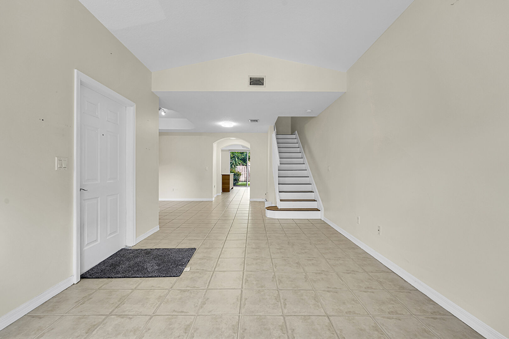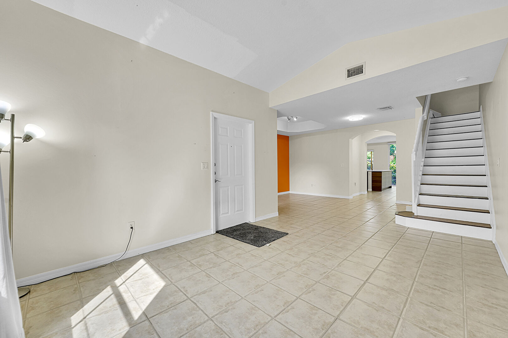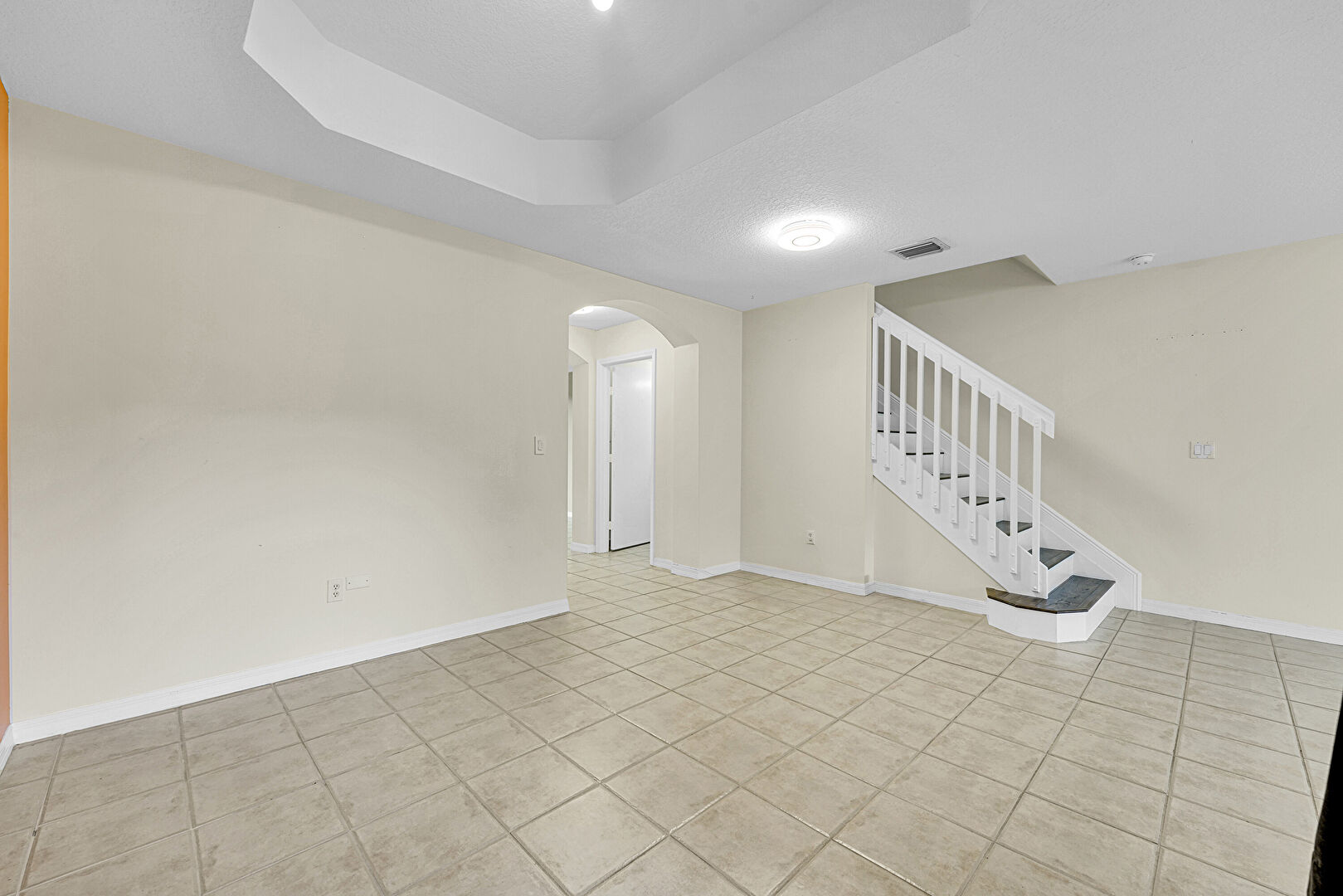 Arched Walkways, Baseboards Wall, Drywall, Natural Light, Stairs, Textured Ceiling, Tile Floor, Tray Ceiling, Vaulted Ceiling, Vent, Arched Walkways, Stairs, Vent