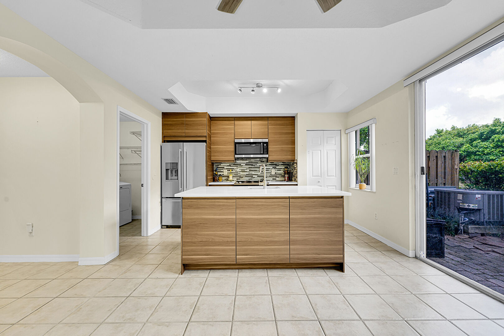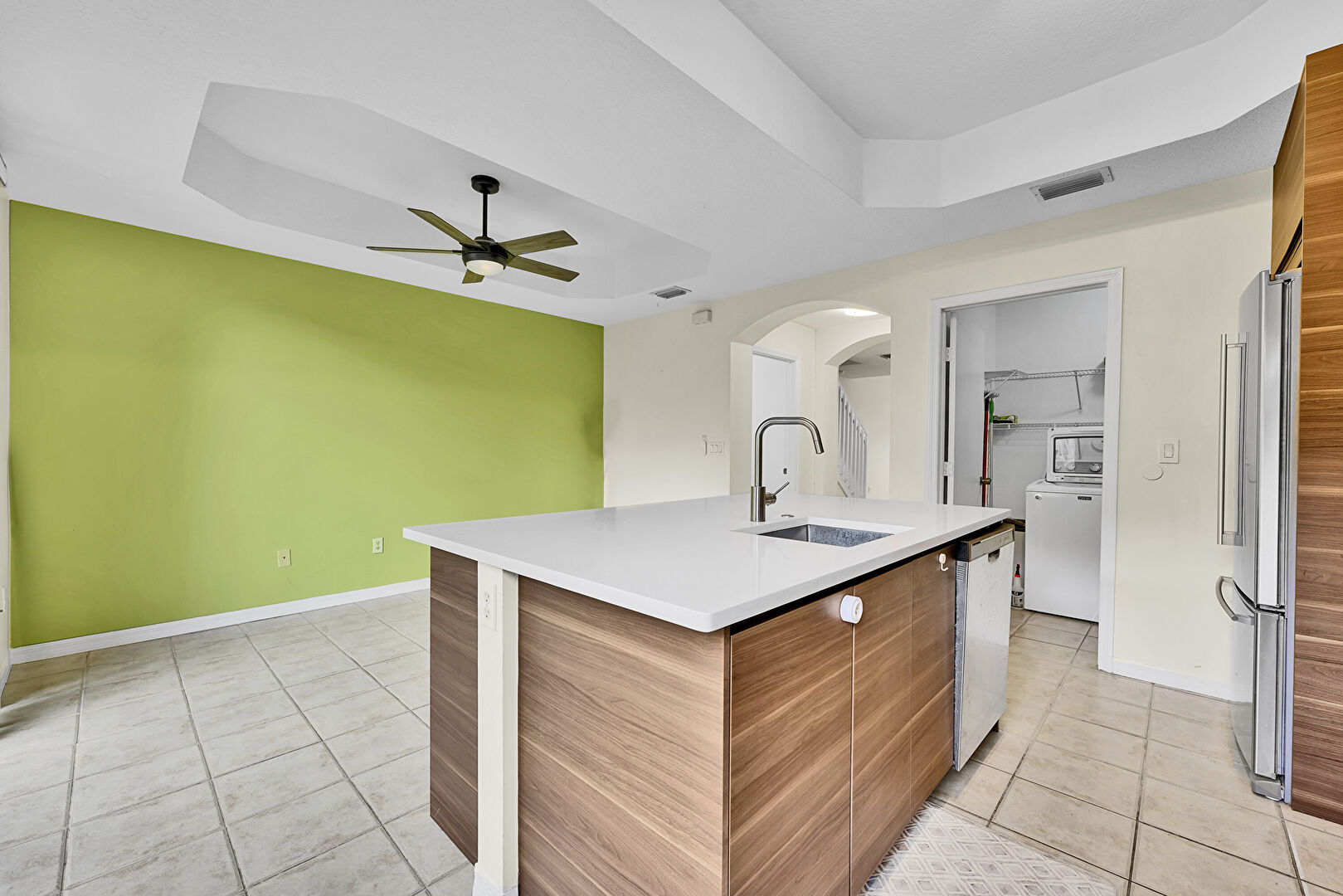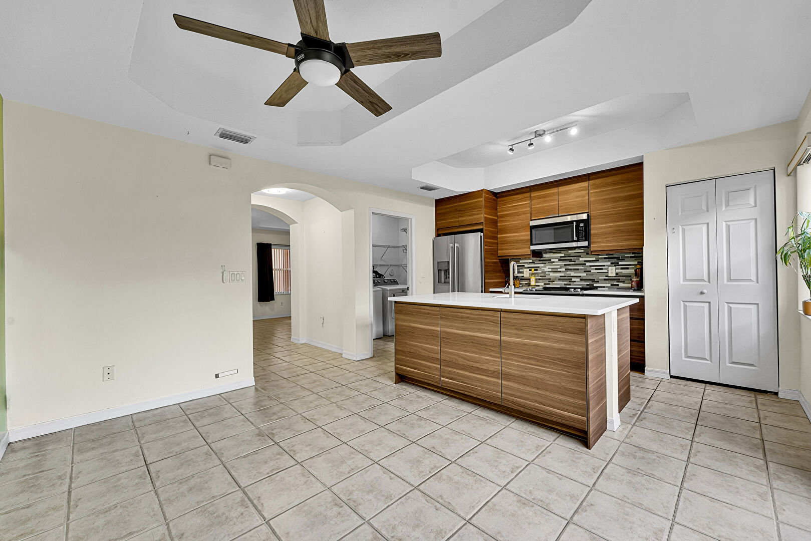 Arched Walkways, Baseboards Wall, Ceiling Fan, Drywall, Flat Panel Cabinets, Floor Ceiling Windows, Kitchen Island, Laundry, Medium Brown Cabinets, Natural Light, One Wall Kitchen, Opens To Living Area, Stone Countertops, Tile Floor, Track Lighting, Tray Ceiling, Vent, Washer Dryer, Drywall, Medium Brown Cabinets, Natural Light, Stone Countertops